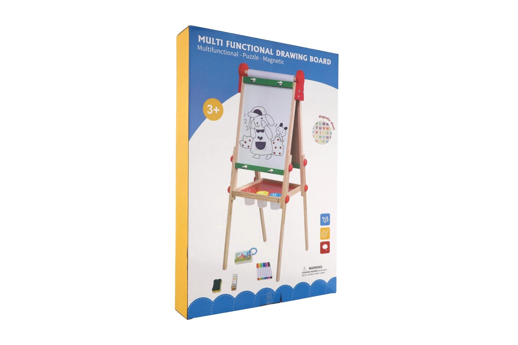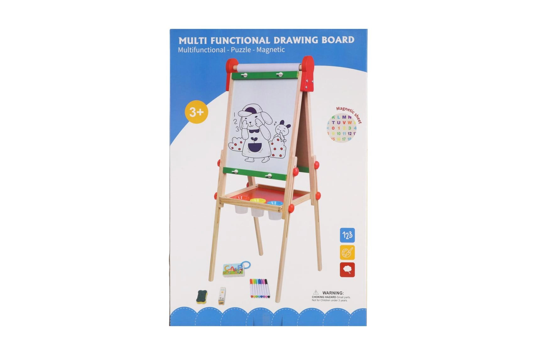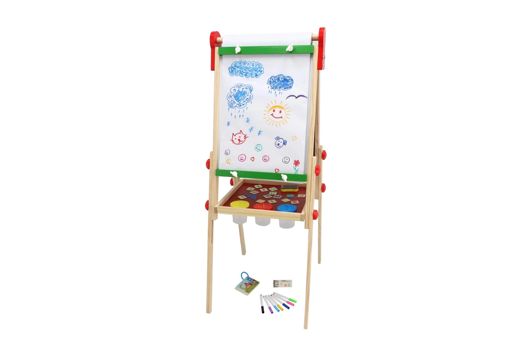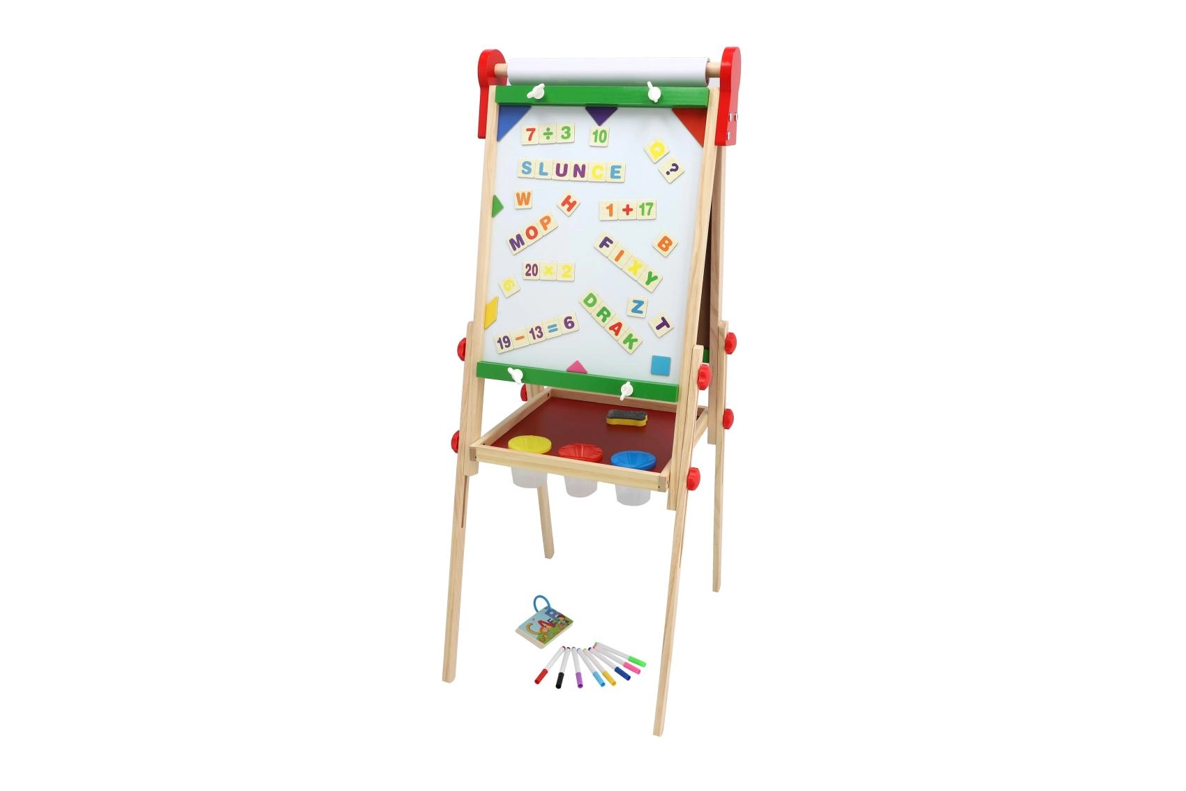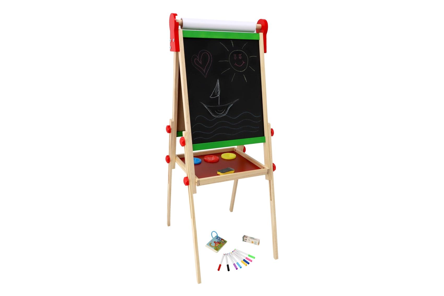 Stabilna drewniana konstrukcja z praktyczną półką odkładczą utrzymuje pod ręką kredy, markery i gąbkę, więc wszystko jest przejrzyste i bezpieczne. Bogate akcesoria wspierają kreatywność, małą motorykę i umiejętności przedszkolne – pisanie, liczenie i rozpoznawanie kształtów.