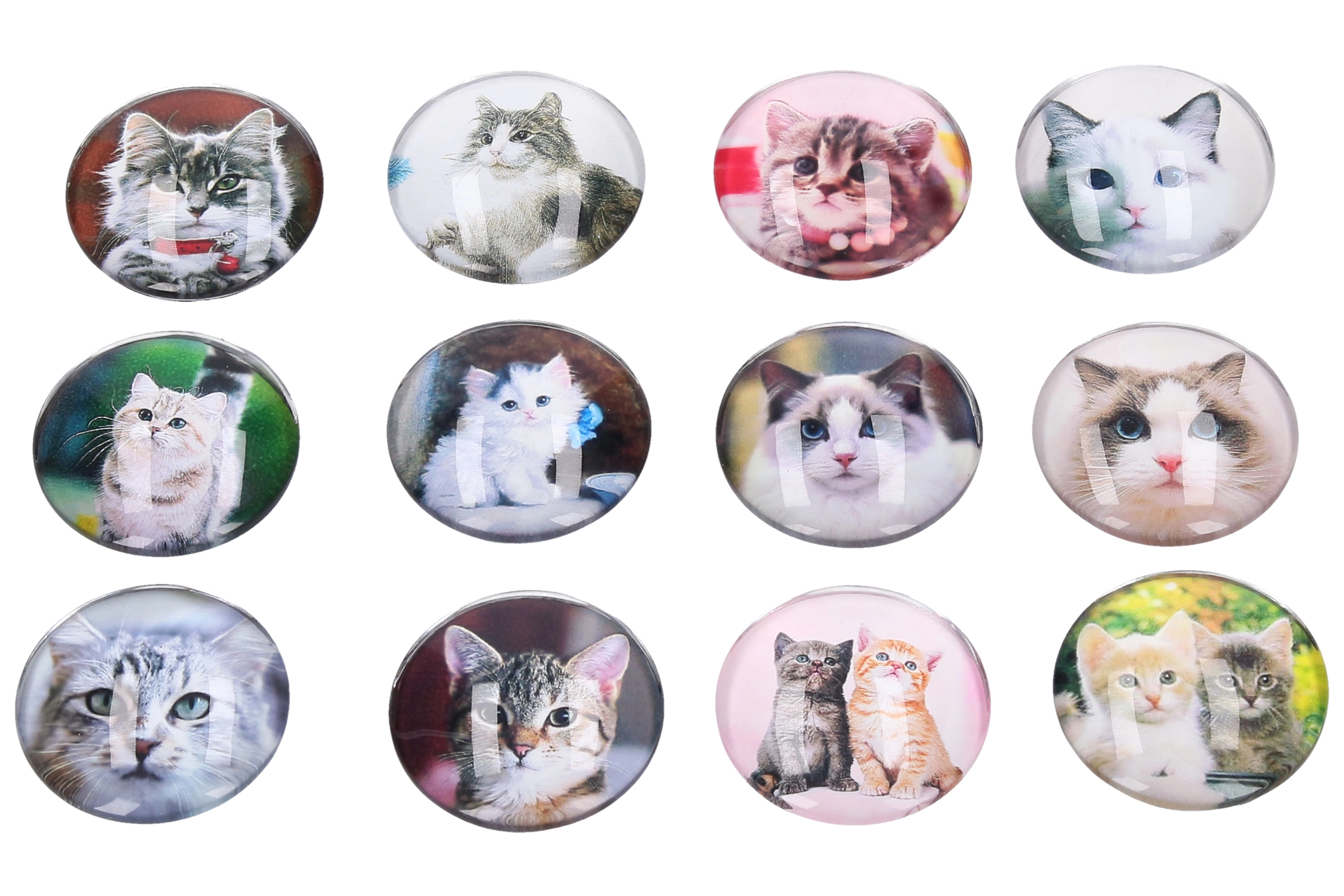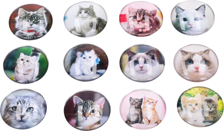 Ożyw dom lub biuro stylowym dodatkiem. Ten szklany magnes z kotem łączy atrakcyjny design i niezawodną funkcjonalność. Średnica 4 cm jest idealna do przypinania karteczek, zdjęć czy wiadomości na lodówce, magnetycznej tablicy lub metalowych półkach. Każdy egzemplarz jest dostarczany w miksie kocich motywów, więc każdy magnes to mały oryginał.