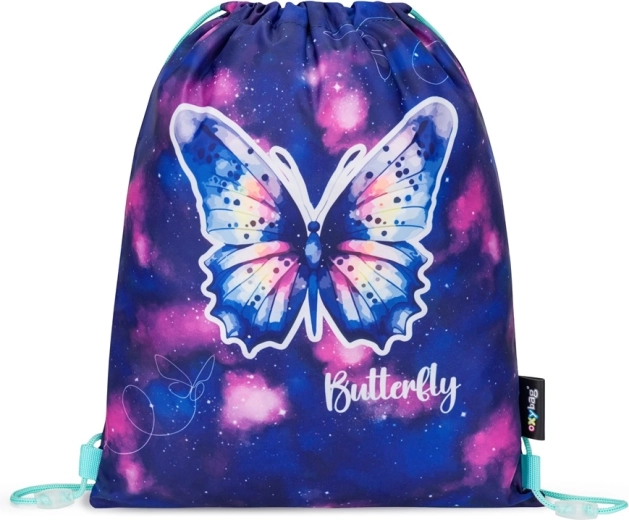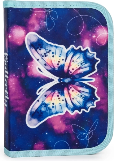 W komplecie jednopoziomowy piórnik z dwiema klapkami oraz worek ze ściąganymi sznurkami w spójnym designie Motyl.