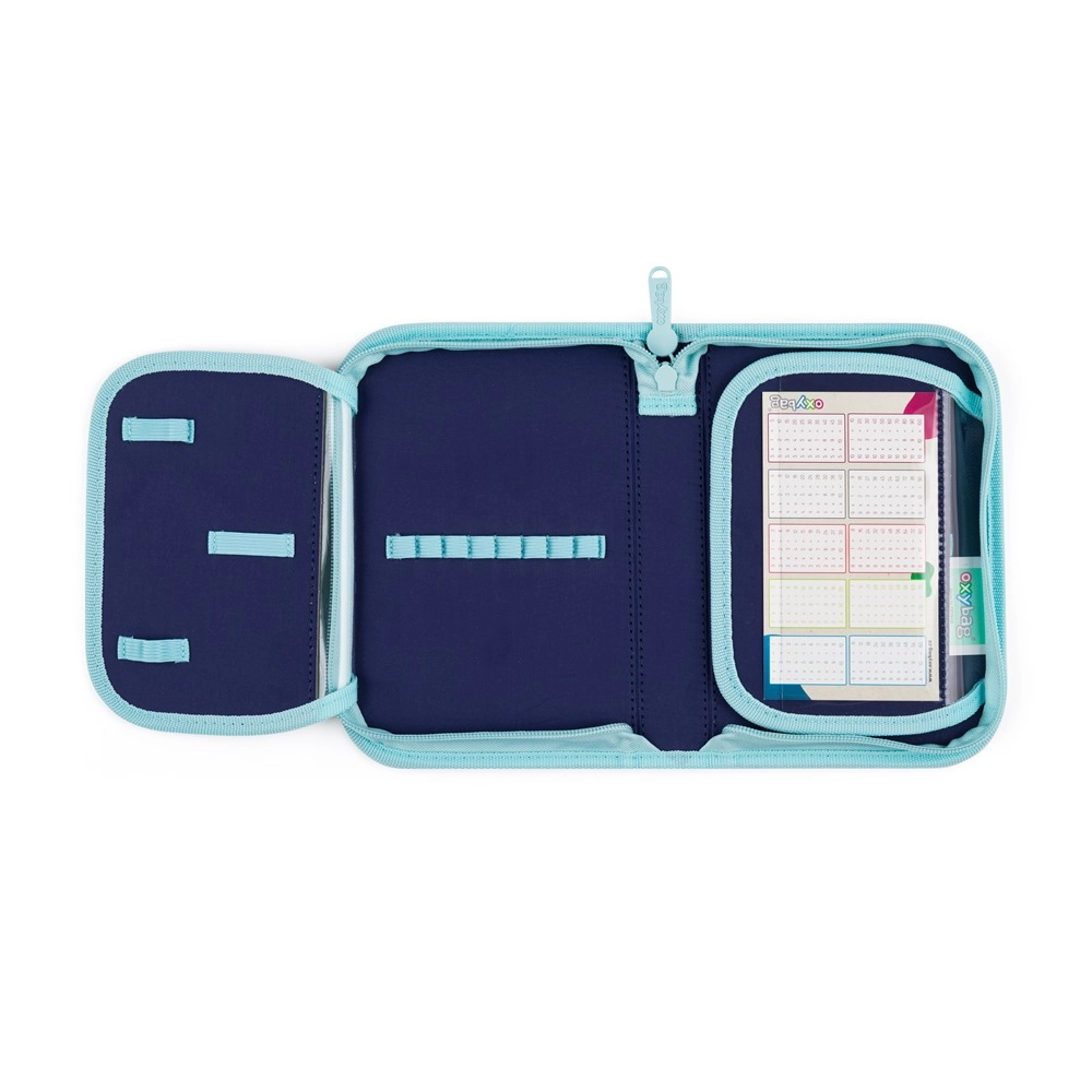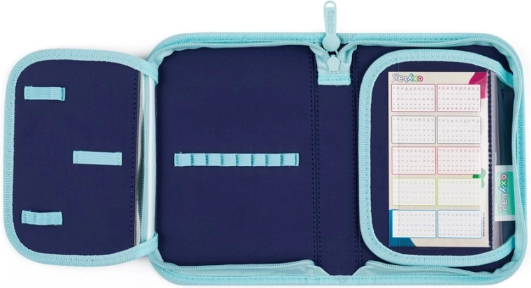Bezpieczeństwo w drodze do szkoły podnoszą elementy odblaskowe, a stabilność zawartości zapewnia solidne, łatwe do czyszczenia i wodoodporne dno. W skład zestawu wchodzi worek na plecy ze ściąganymi sznurkami na sport lub obuwie zmienne oraz jednopoziomowy piórnik z dwiema klapkami z uchwytami na przybory piśmiennicze i przezroczystą folią na plan lekcji.