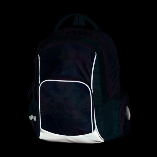 Przemyślany układ wewnętrzny z dwiema głównymi komorami, przednią kieszenią i bocznymi kieszeniami (otwarta i na zamek) ułatwia przejrzyste przechowywanie podręczników, zeszytów i drugiego śniadania. Wodoodporne, mocne dno chroni zawartość także przed zabrudzeniem. Praktyczne haczyki skracają długie paski, a elementy odblaskowe zwiększają widoczność i bezpieczeństwo w drodze do szkoły.