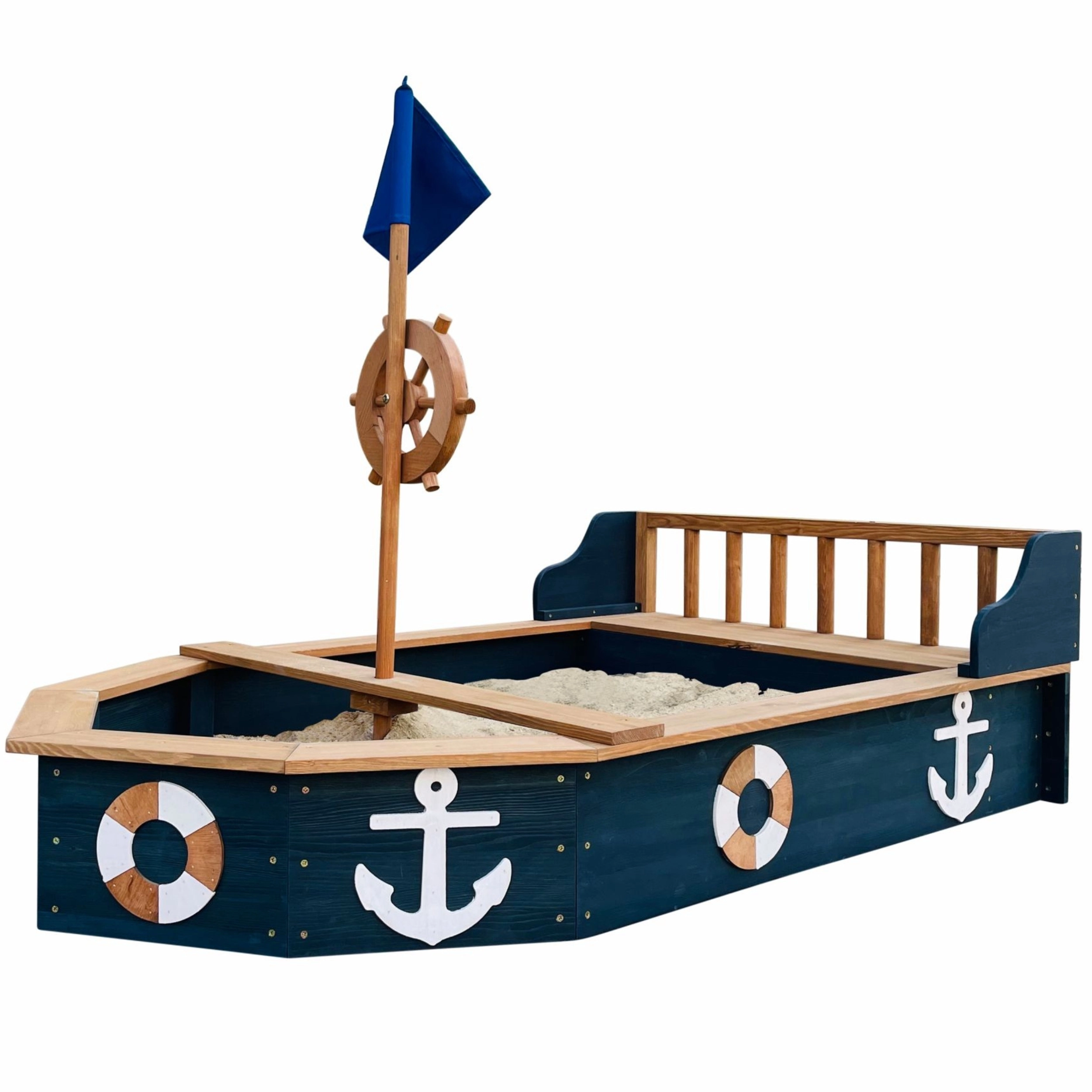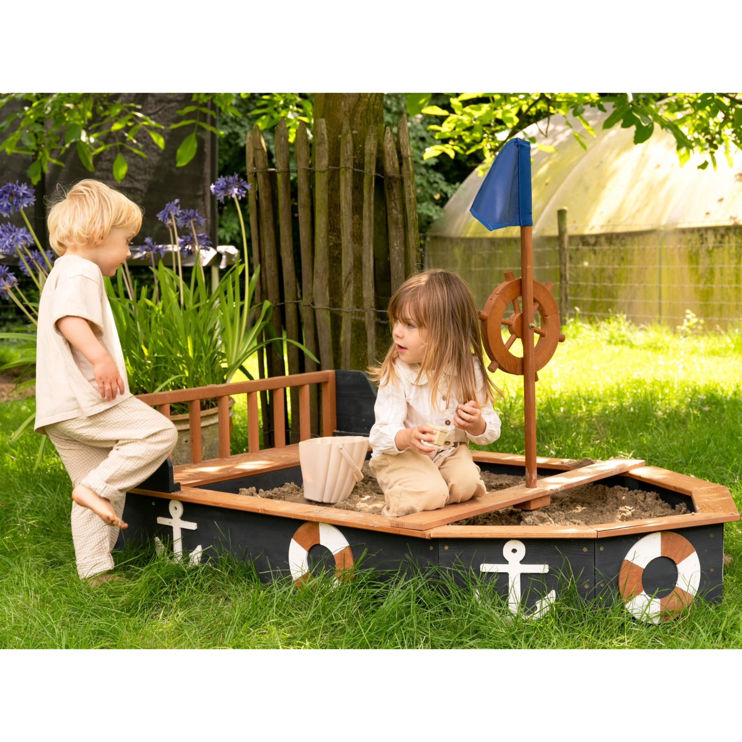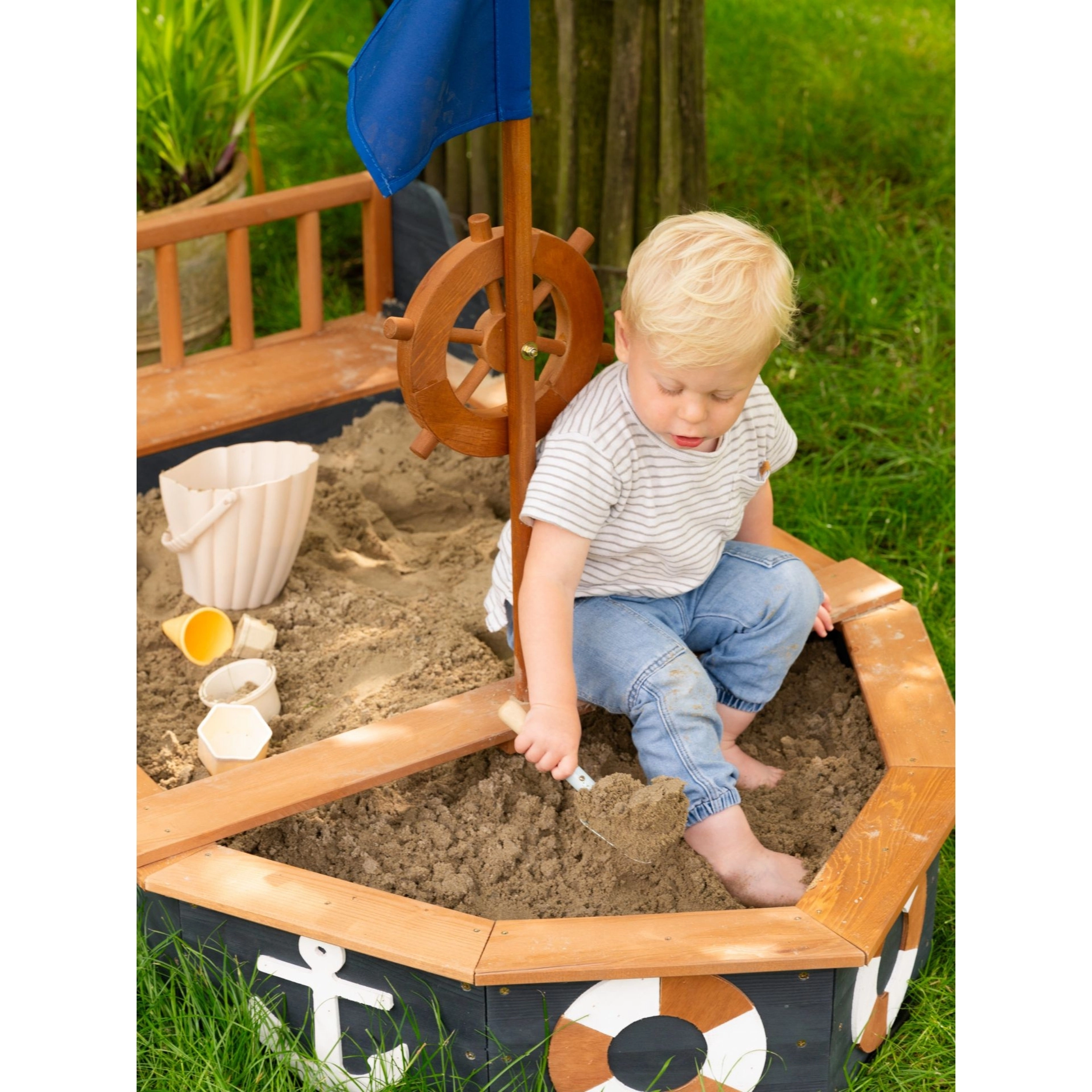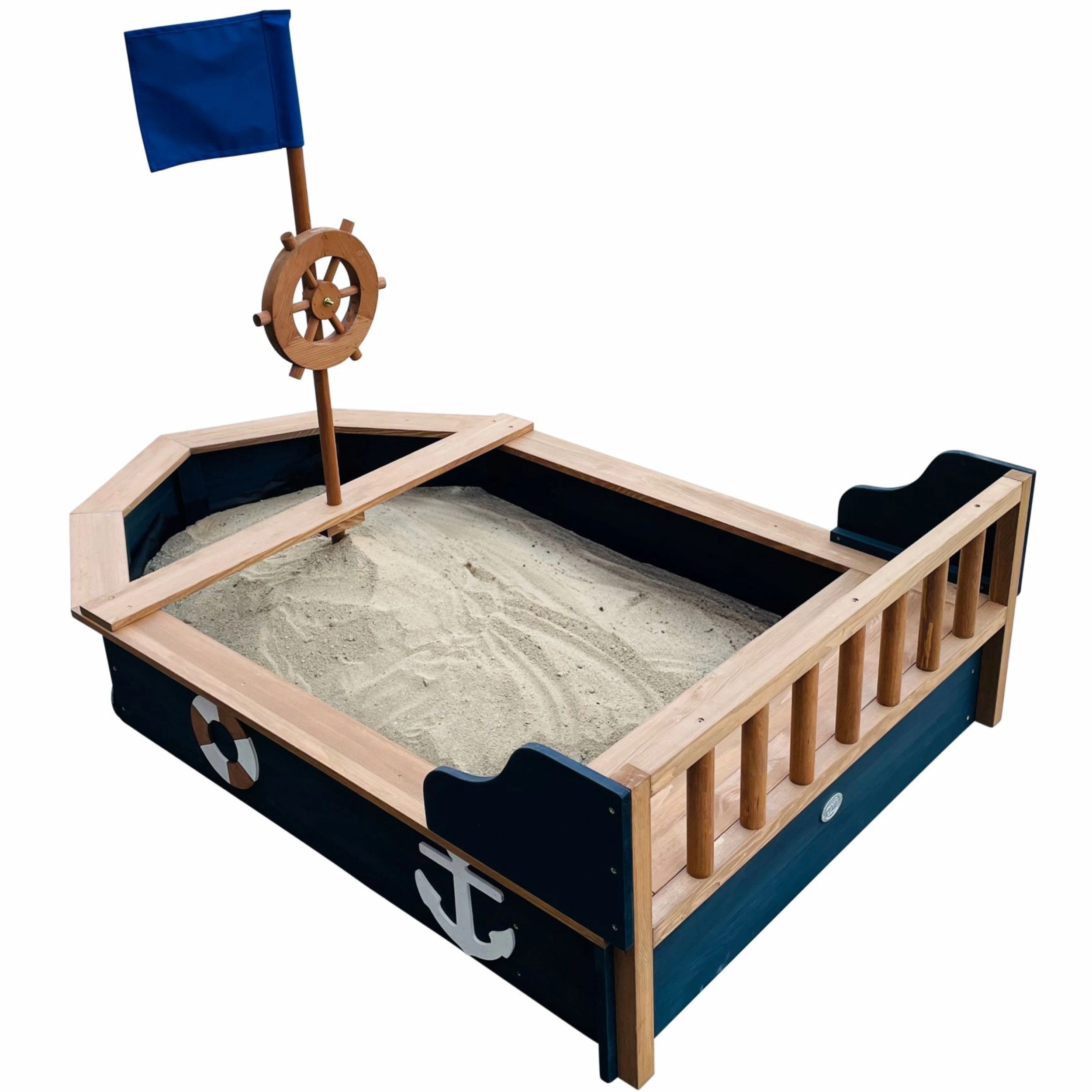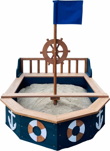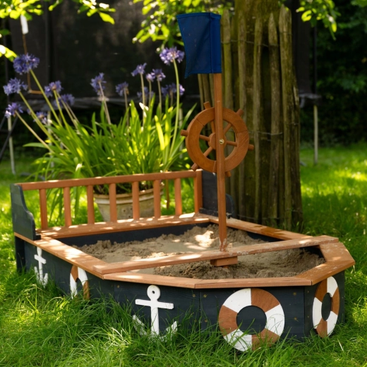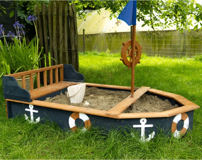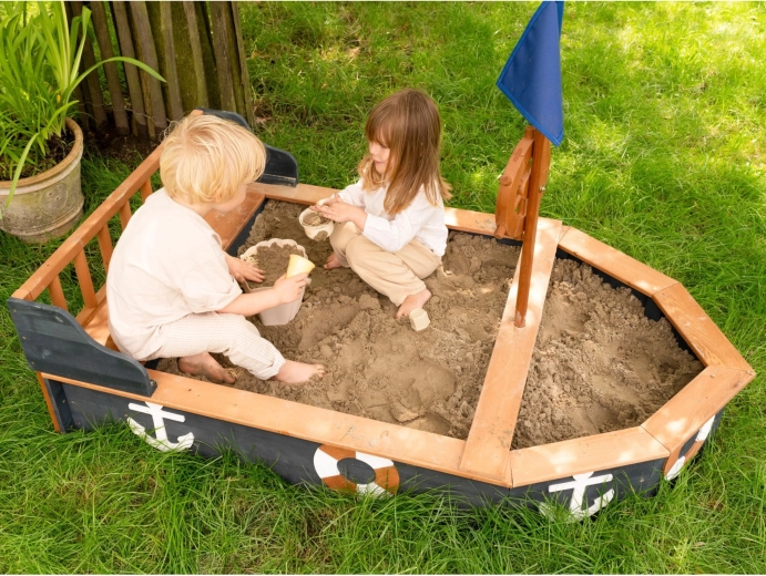 Piracka piaskownica AXI Doris w kształcie łodzi zamieni każde popołudnie w ekscytujący rejs. Dzieci pokochają obrotowe koło sterowe, maszt z niebieską flagą oraz tematyczne kotwice i koła ratunkowe po bokach. Szerokie krawędzie i zintegrowane siedziska zwiększają wygodę podczas zabawy i budowania zamków.