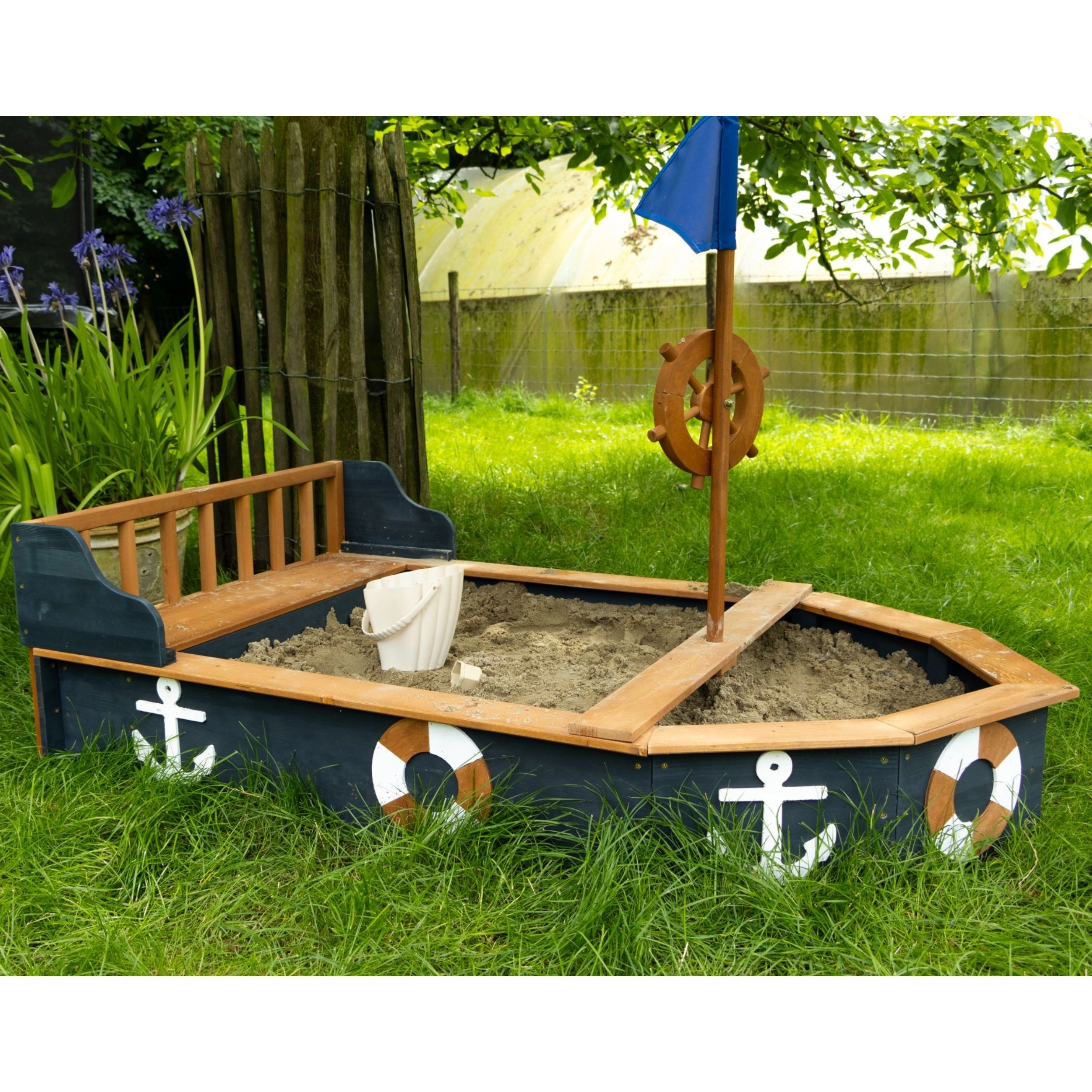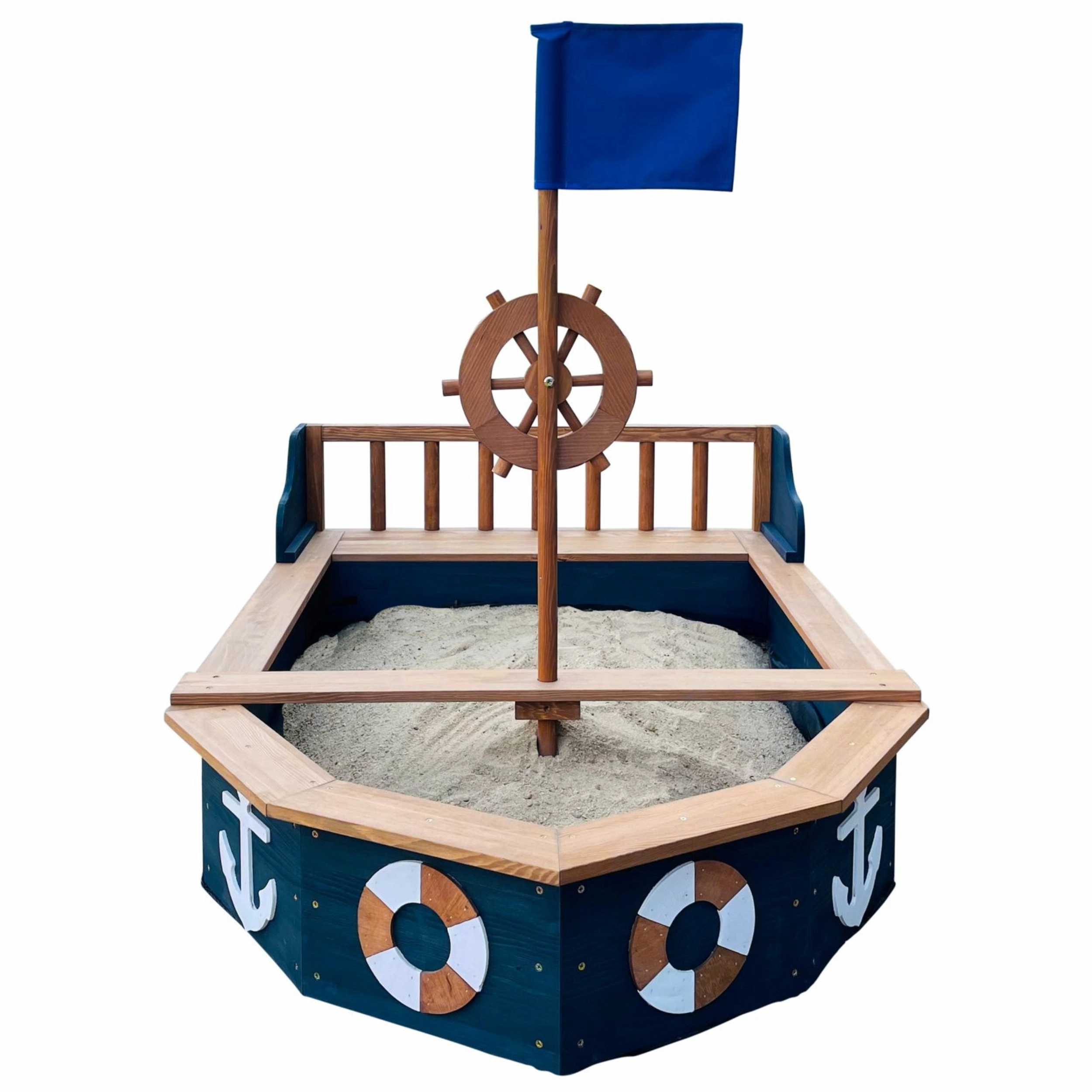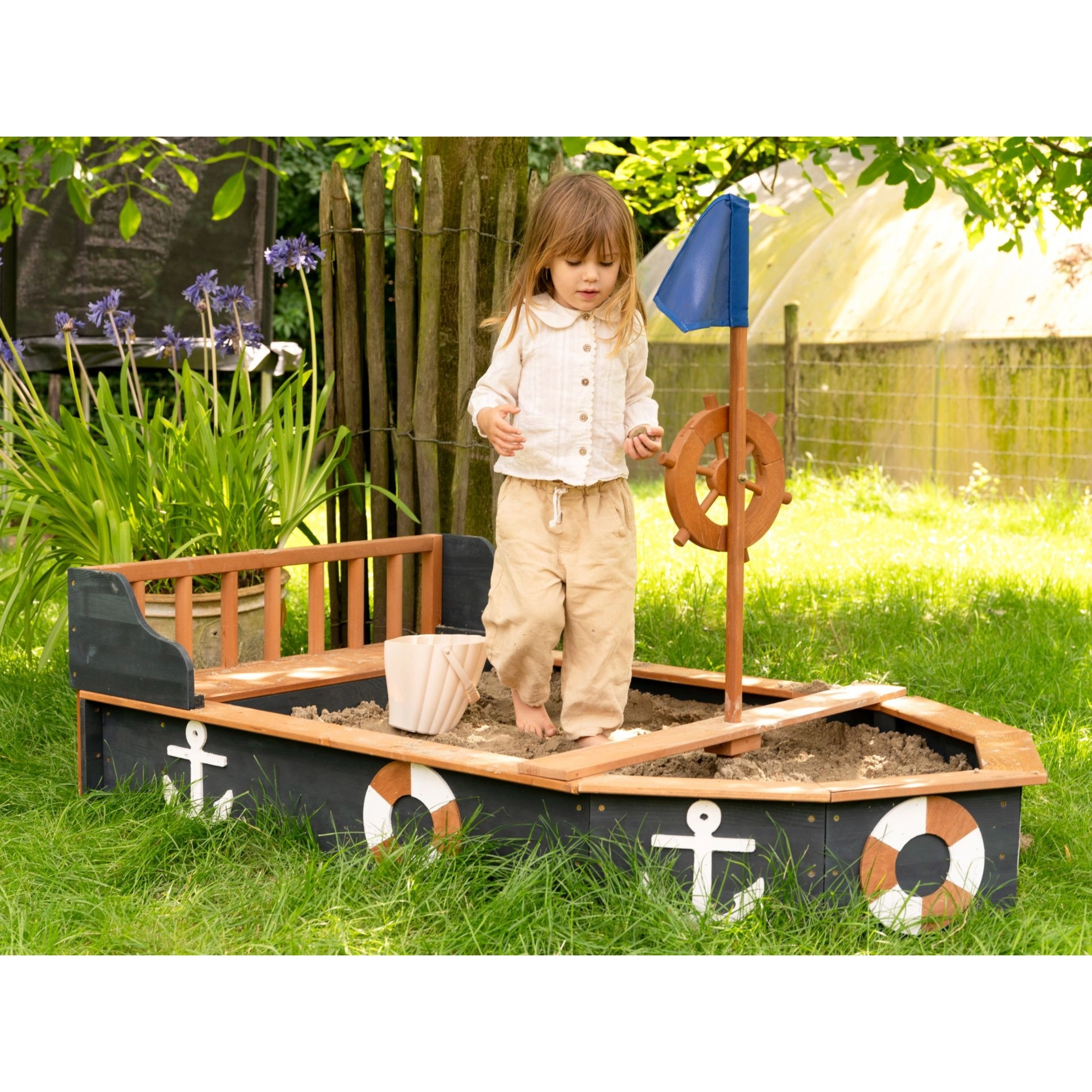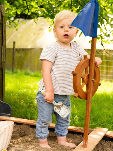 Zamień ogród w okręt pełen przygód z piaskownicą AXI Doris. Solidna drewniana konstrukcja, obrotowe koło sterowe, maszt z flagą oraz morskie dekoracje pobudzają wyobraźnię i kreatywną zabawę. Praktyczna ławka ze schowkiem, plachta ochronna i mata utrzymują piasek w czystości. Drewno z certyfikatem FSC z bejcą wodną i odpornością na warunki pogodowe zapewnia bezpieczne i długotrwałe użytkowanie.