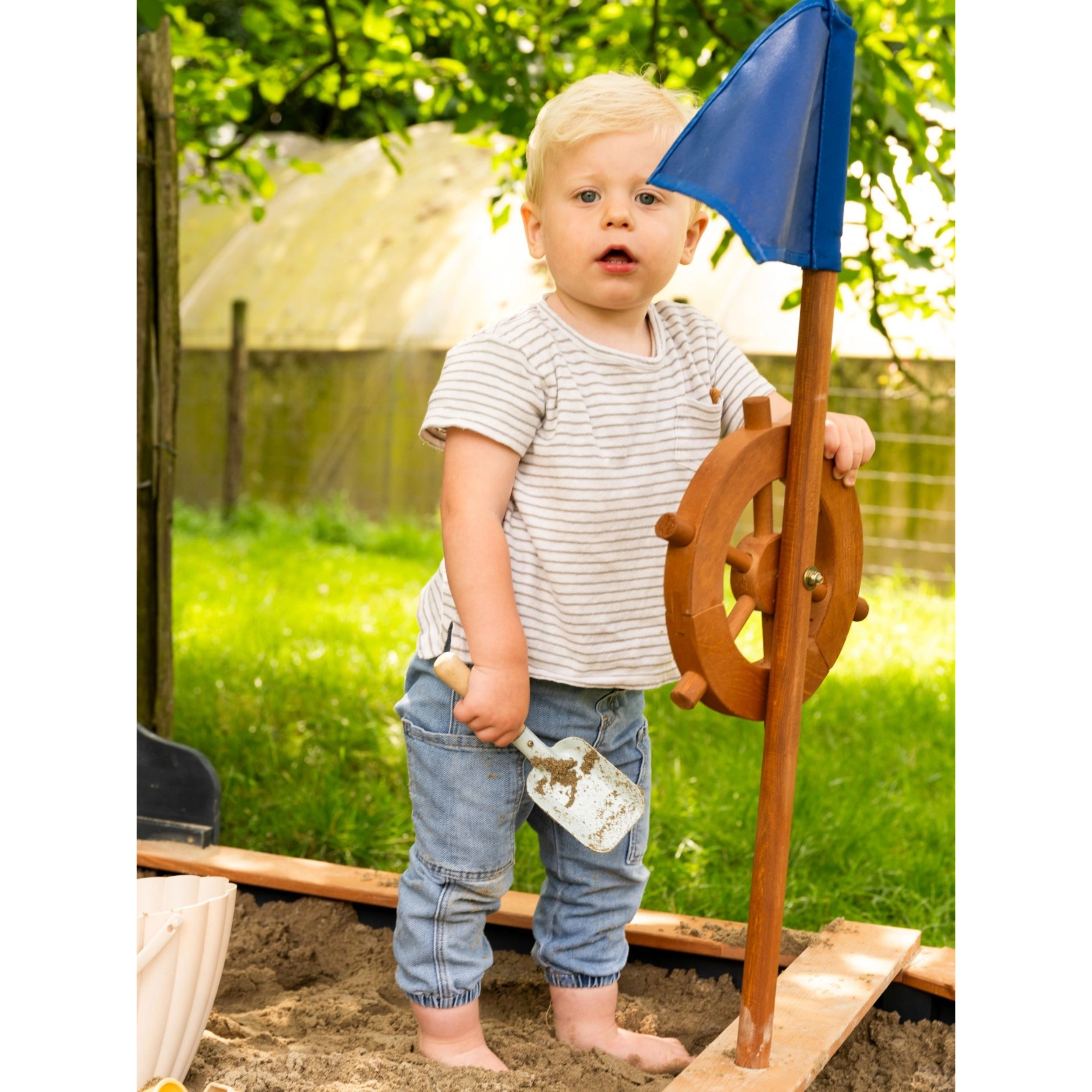 Realistyczne elementy statku wciągają dzieci do zabawy – kołem sterowym można obracać, a niebieska flaga na maszcie podkreśla piracki klimat.