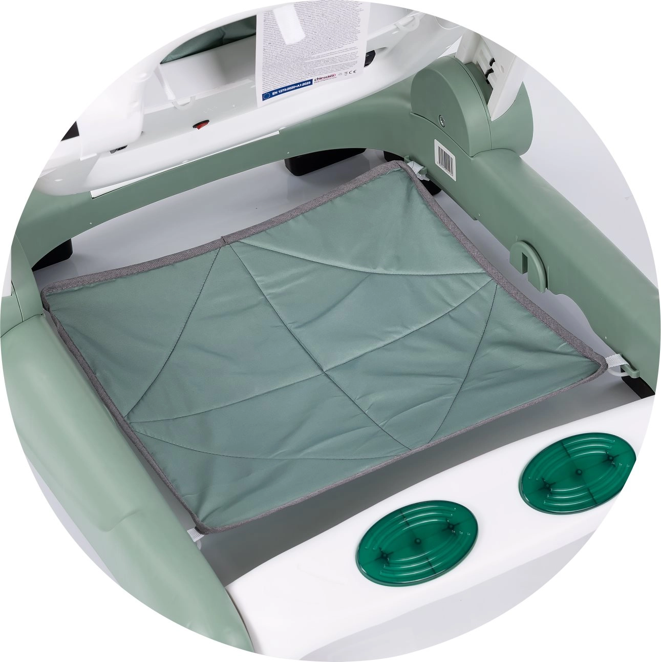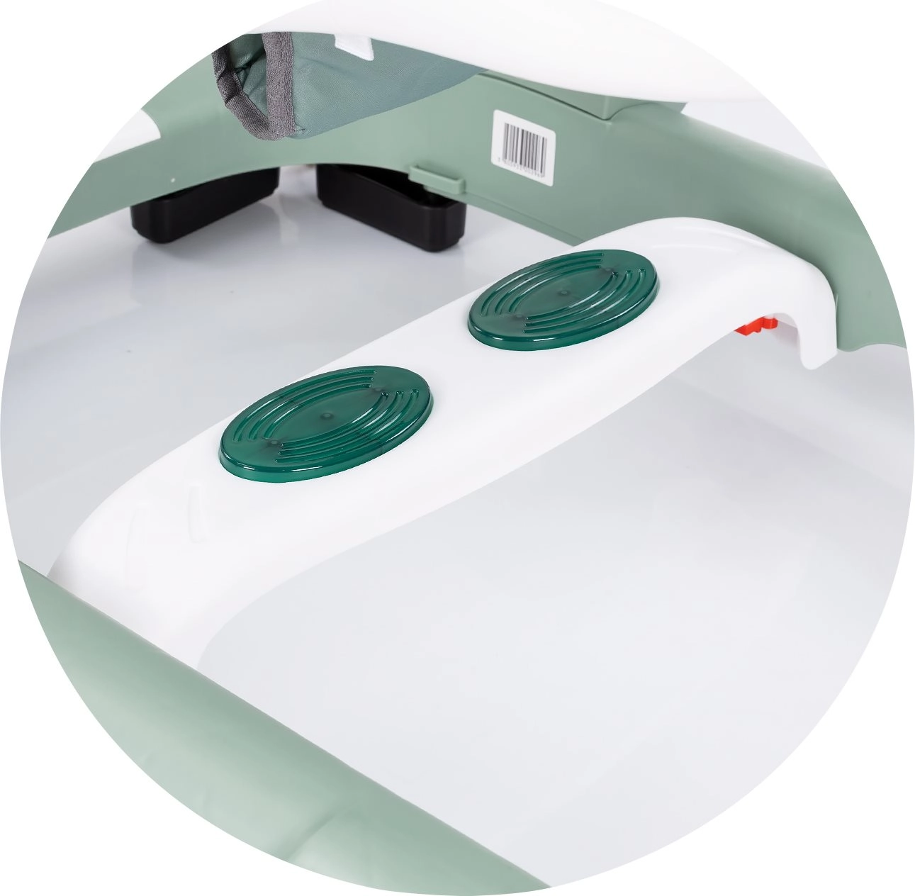 Antypoślizgowe podkładki, stopery, blokowane kółka i regulacja prędkości uzupełnia miękkie siedzisko oraz stabilna, szeroka podstawa.