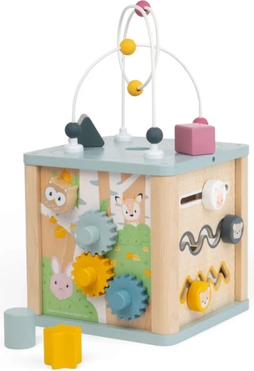 Odkryj wszechstronną drewnianą kostkę aktywności dla maluchów, która oferuje godziny mądrej zabawy. Każda strona przynosi inne działanie – sorter kształtów, zębate kółka, tor kulkowy oraz koralikowy labirynt na górze. Wykonana w 100% z drewna z certyfikatem FSC w delikatnych pastelowych barwach, zapewnia bezpieczną zabawę i wspiera rozwój małej motoryki, koordynacji ręka–oko oraz rozwiązywania problemów.