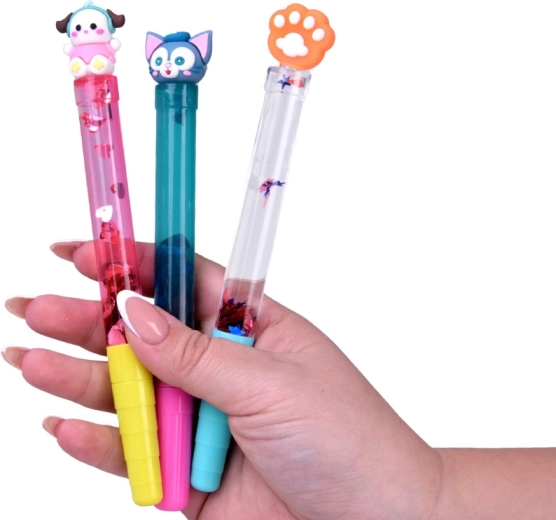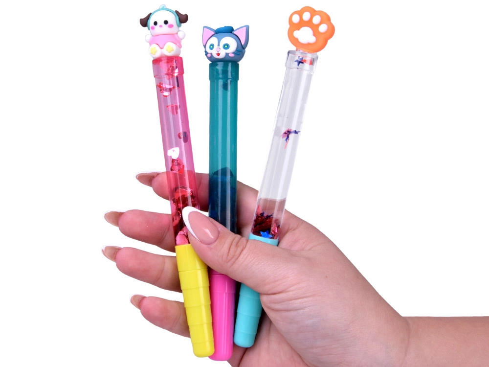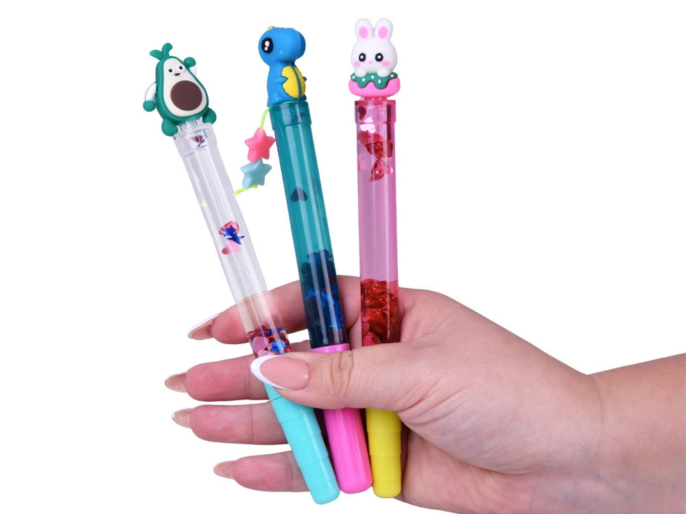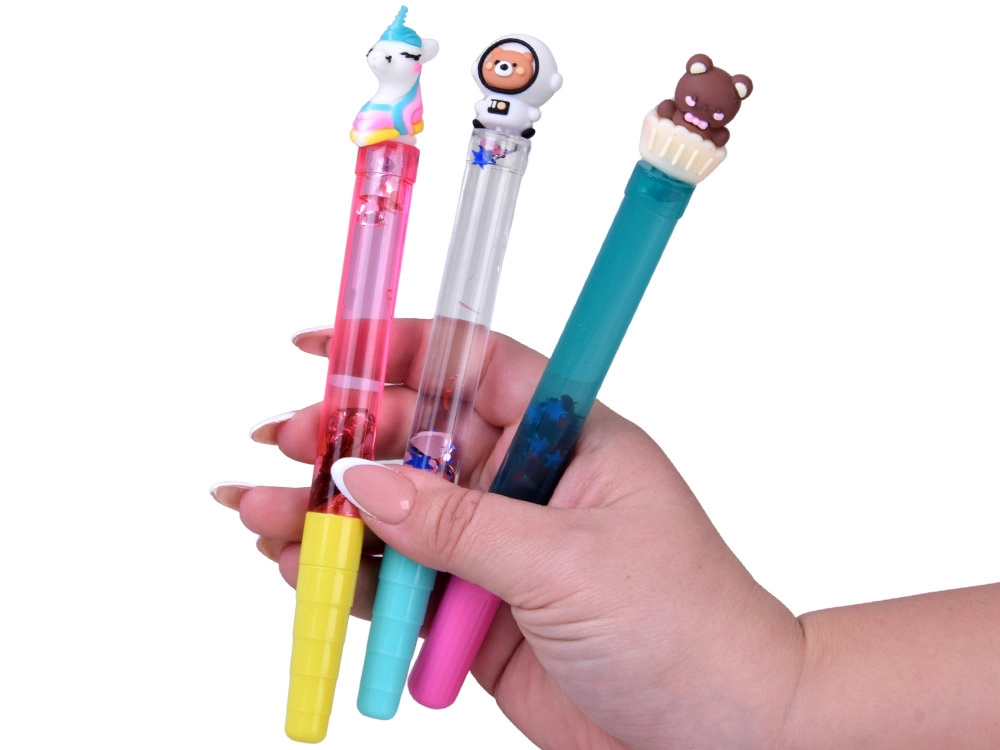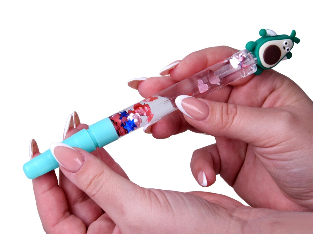 Przezroczysty korpus z wodą i brokatem tworzy czarujący efekt pływających kształtów przy każdym ruchu długopisu.