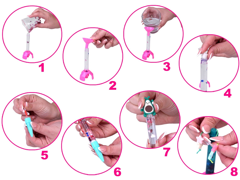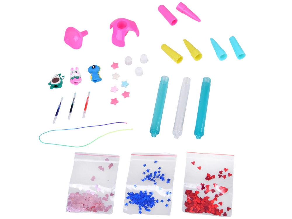 - Wszystko w opakowaniu: korpusy długopisów, wkłady, korki, ustniki, brokat, koraliki, toppery, podstawka z lejkiem i sznureczek