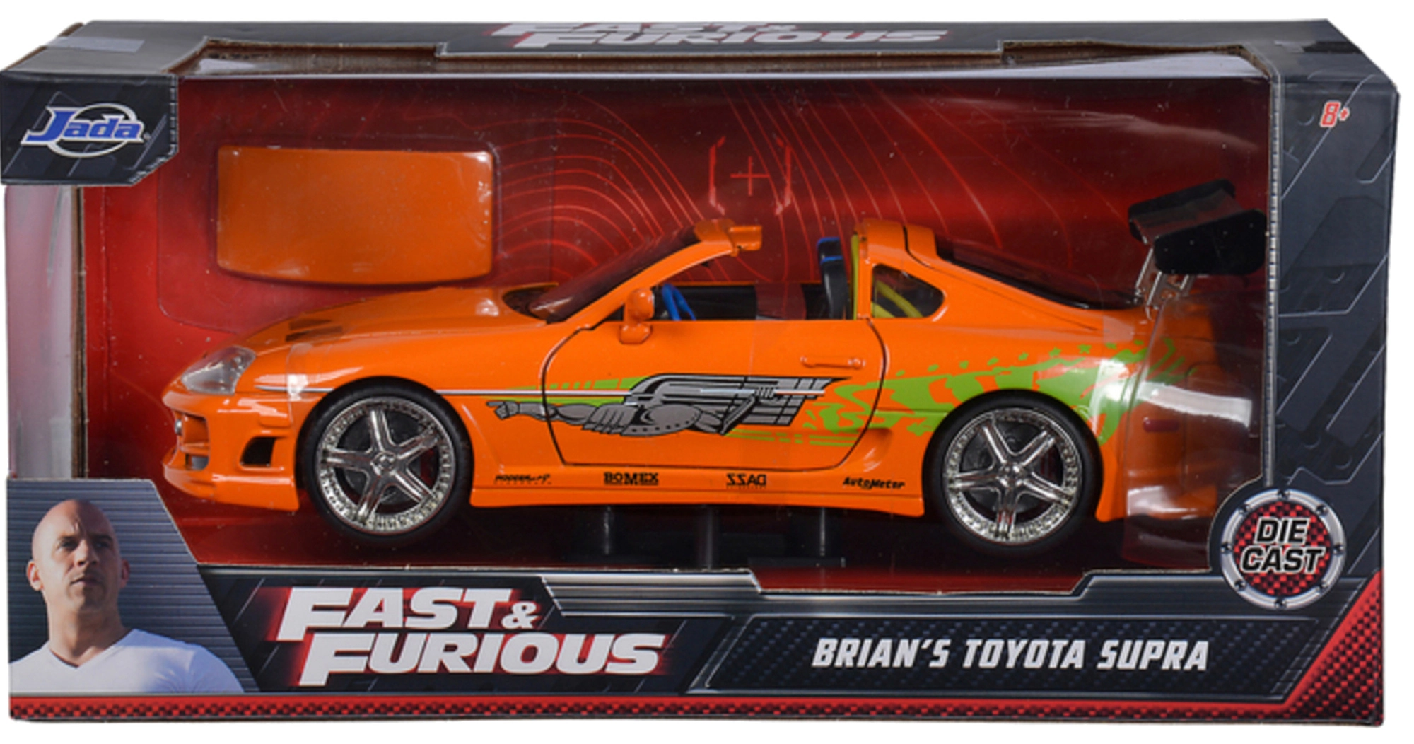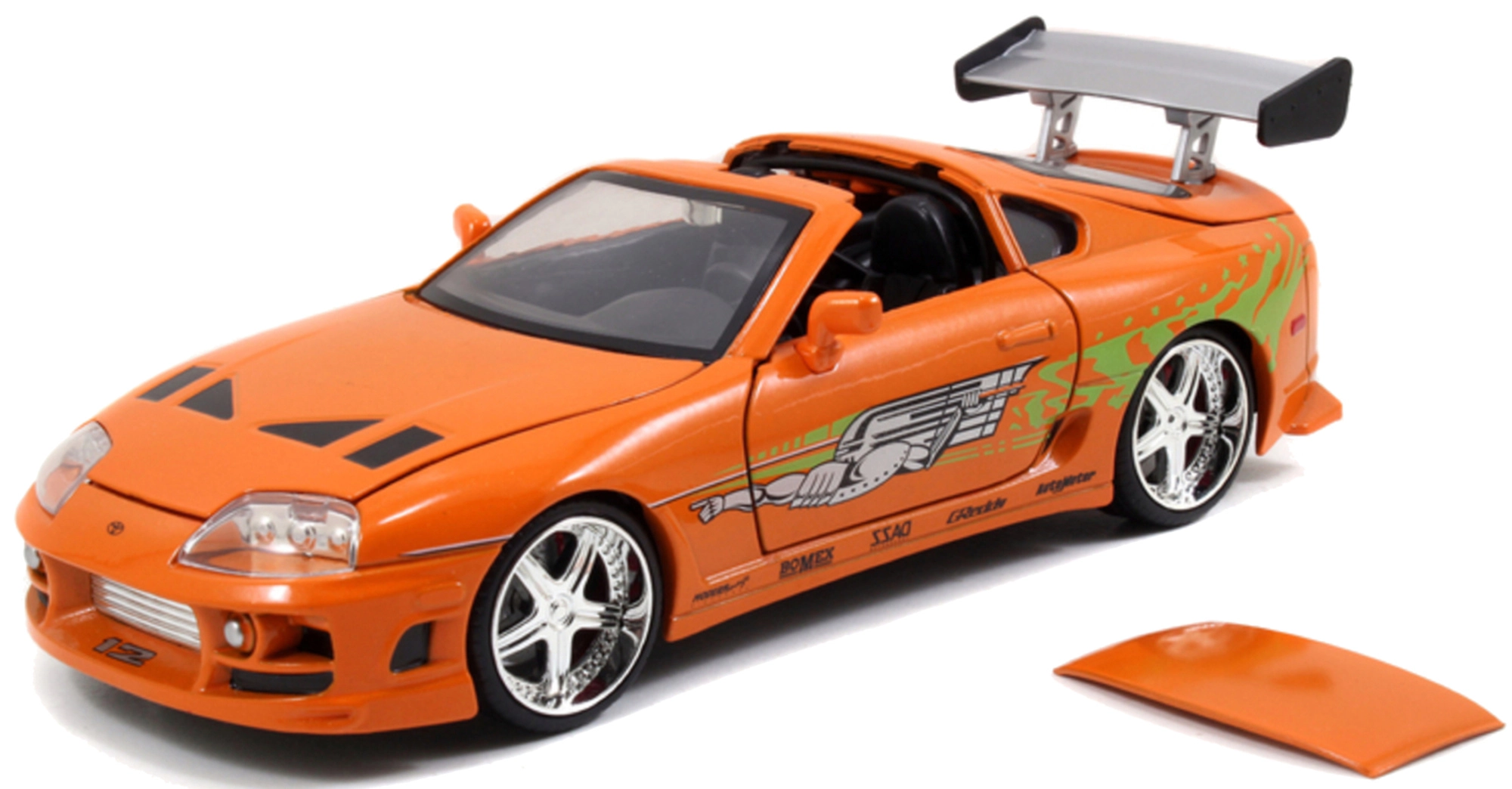 Poczuj adrenalinę serii Fast & Furious dzięki precyzyjnej replice Toyota Supra marki Jada Toys. Model o długości ok. 19 cm oferuje metalowe nadwozie, otwierane drzwi i klapę bagażnika oraz detalne wykonanie w kultowym pomarańczowym kolorze – idealny dla kolekcjonerów i fanów szybkich aut.