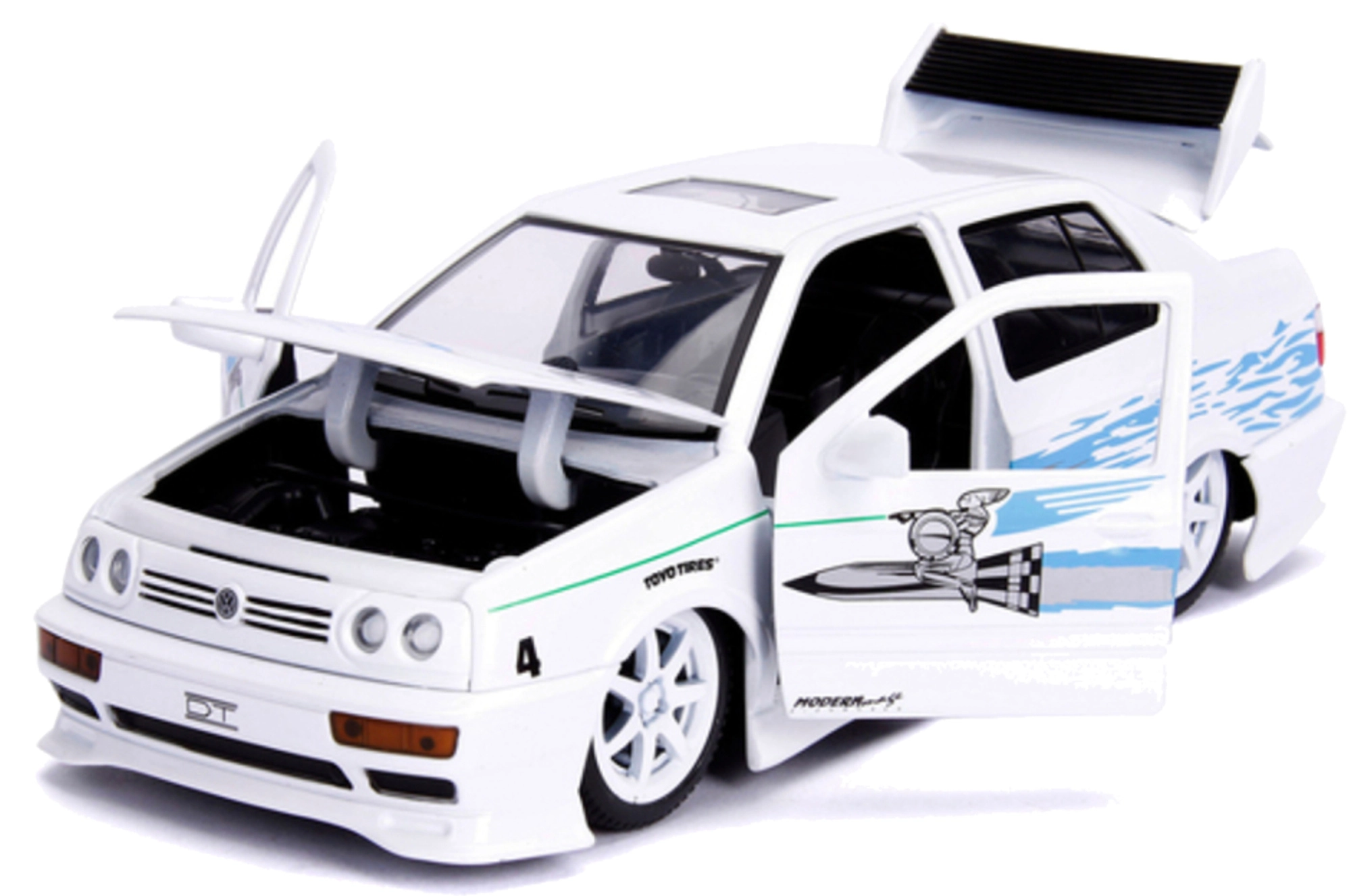 Ten szczegółowo wykonany model Volkswagen Jetta z serii filmowej SZYBCY I WŚCIEKLI ucieszy każdego miłośnika szybkich aut i filmowych klasyków. Dzięki solidnej metalowej karoserii w białym kolorze oraz otwieranym elementom prezentuje się niezwykle realistycznie i doskonale wygląda w kolekcji.