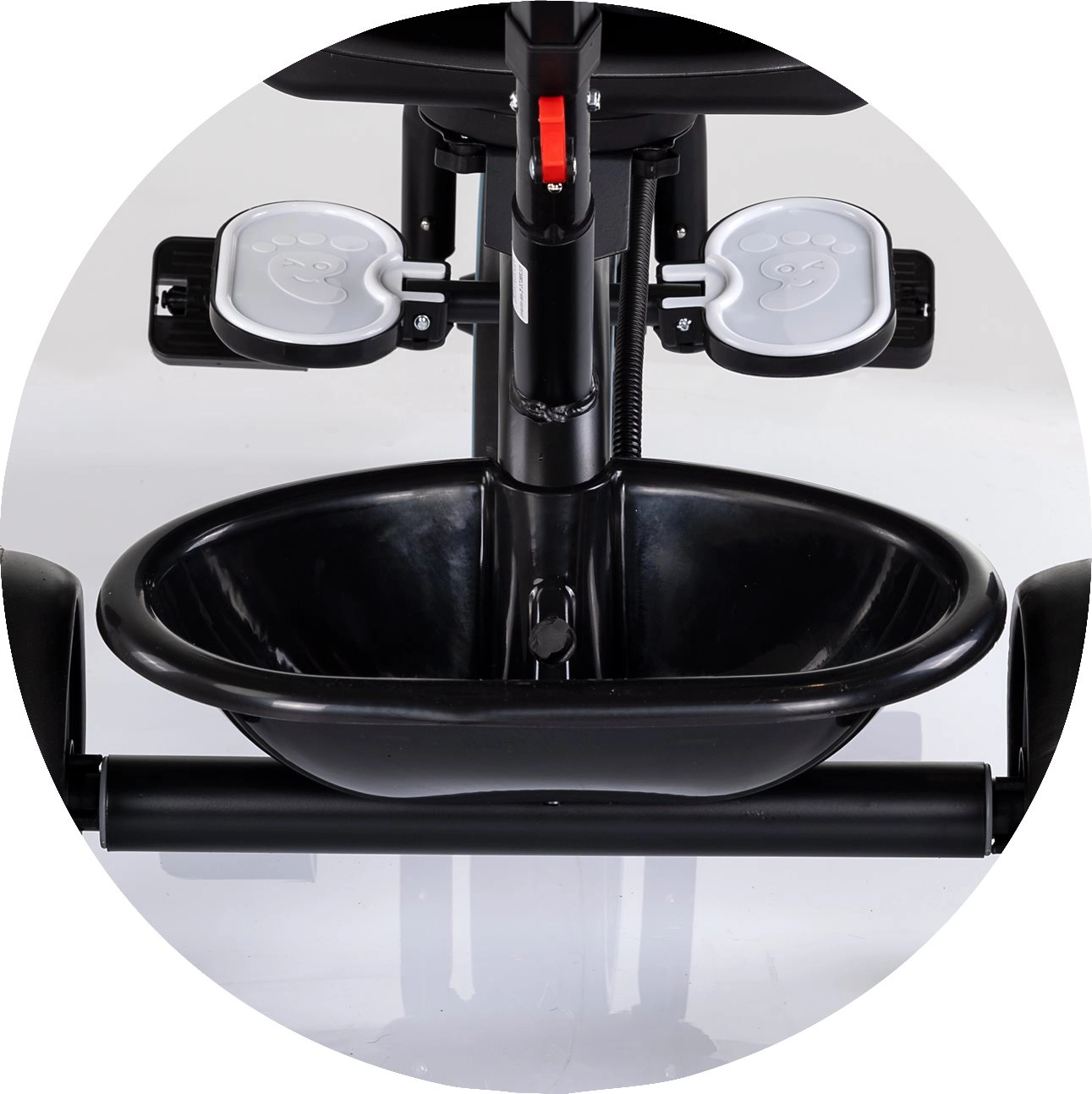 Na słoneczne dni przygotowano składany daszek z osłoną przeciwsłoneczną, a składany i ruchomy podnóżek wspiera odpoczynek młodszych dzieci. Praktyczne wyposażenie obejmuje uchwyt na butelkę z możliwością montażu w dwóch pozycjach oraz koszyki do przechowywania z przodu i z tyłu na drobiazgi. Odłączane elementy (daszek, rączka, pałąk) umożliwiają łatwe przekształcenie w trójkołowiec dla starszego dziecka.