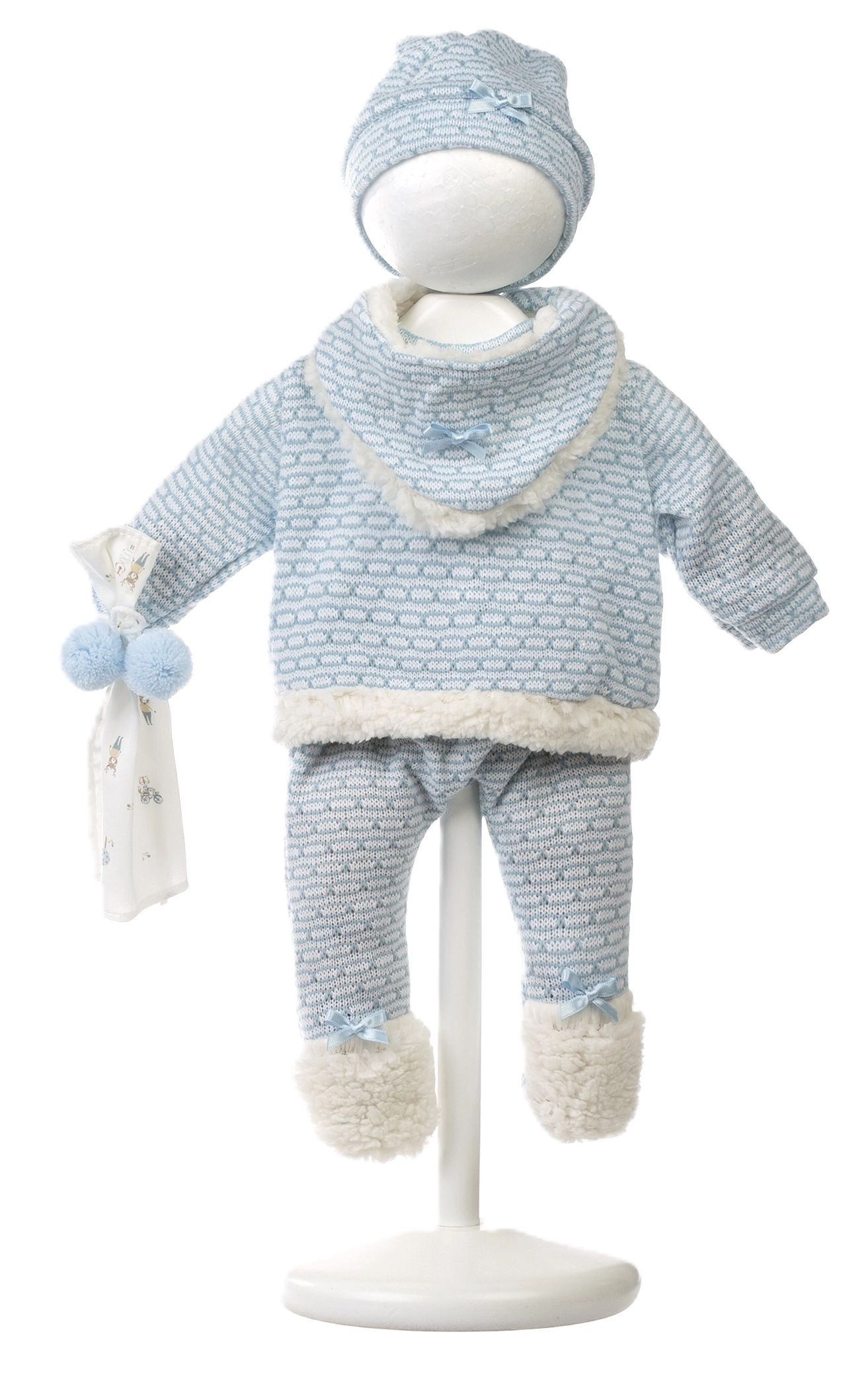- Kompletny zestaw – 4 szt. ubranek + przytulanka z pomponikami + poduszeczka/podkładka