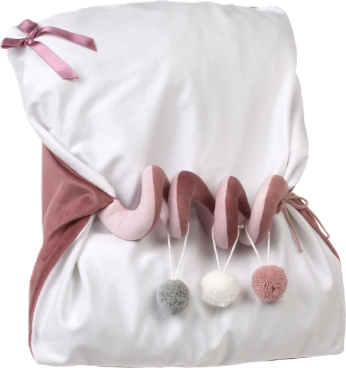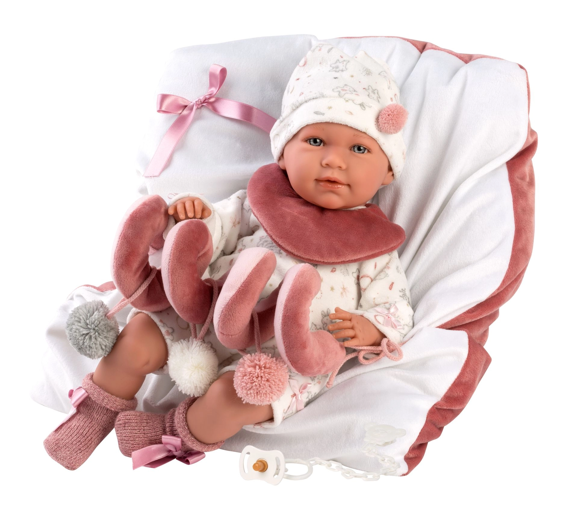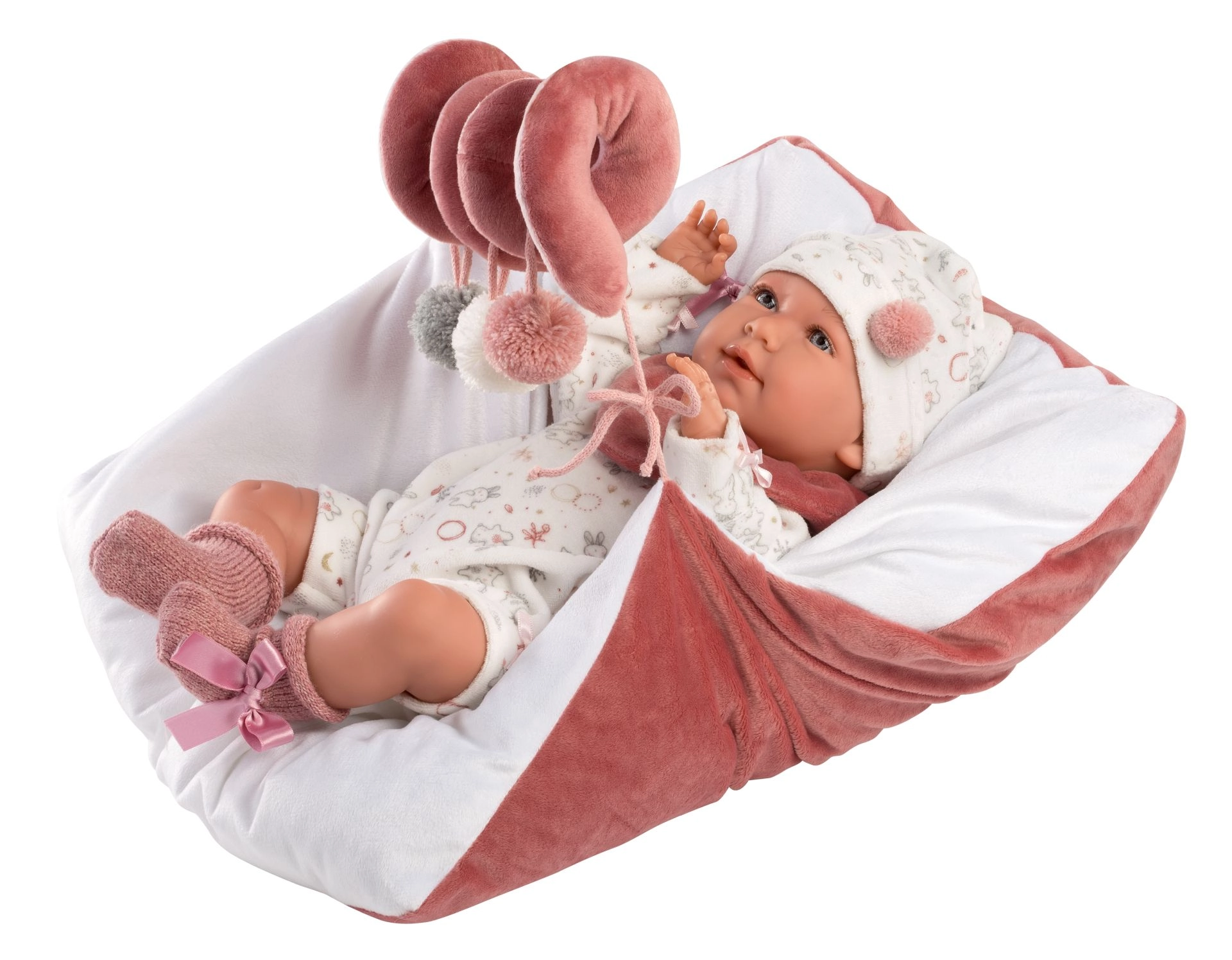 Zawieszone pluszowe elementy na spirali zajmą dziecko, wspierają rozwój motoryki i tworzą przytulne otoczenie podczas zabawy lalką.