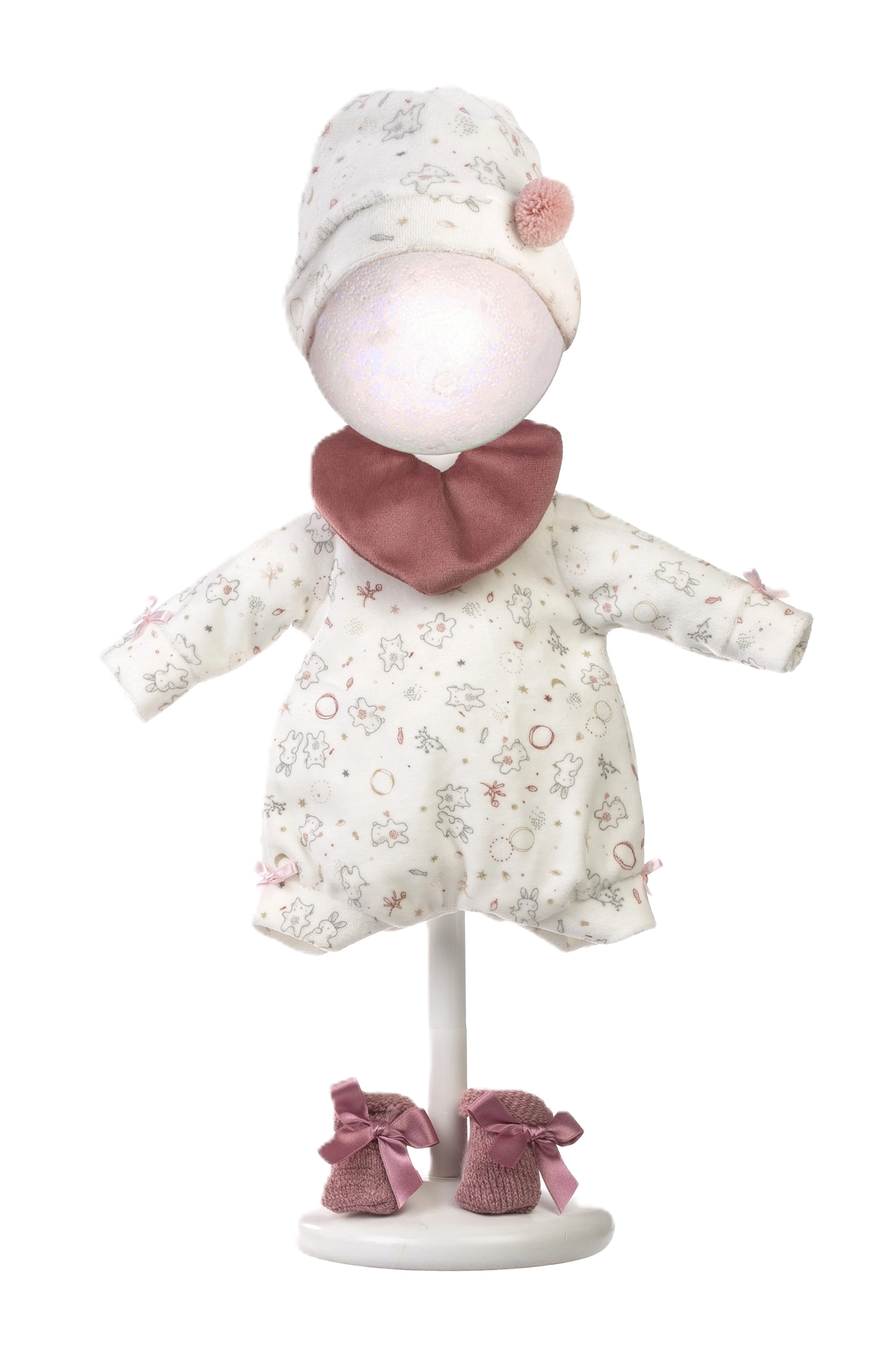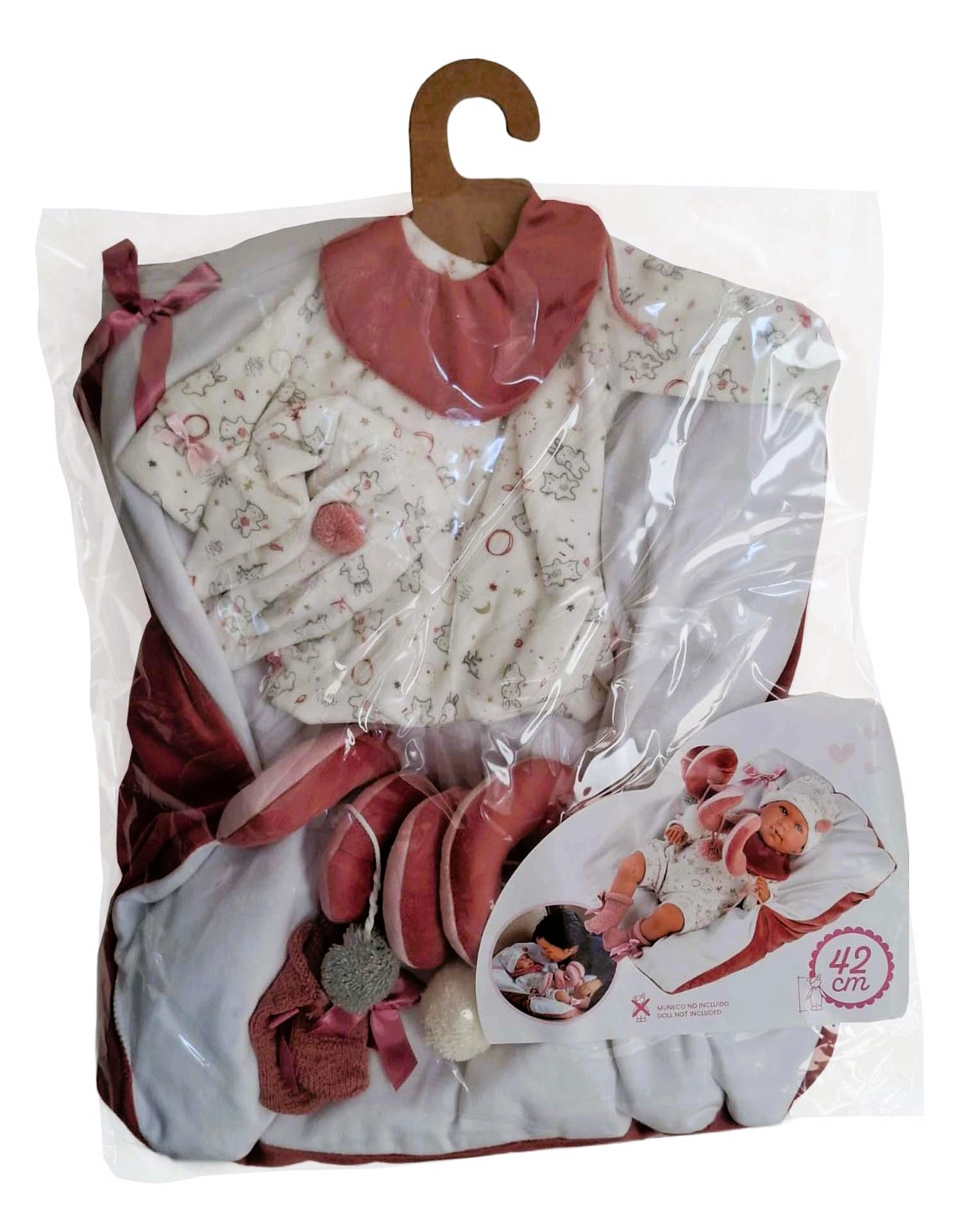 Stylowy zestaw dla lalek w rozmiarze 40–42 cm zawiera wszystko do wygodnego przebierania i zabawy: 2 części ubranka, aksamitny śliniaczek oraz mięciutką matę ze spiralną zabawką. Ręcznie wykonany w Hiszpanii z delikatnych tkanin, idealny do pielęgnacyjnej zabawy i rozwoju motoryki małej. Rekomendowany od 3 lat.