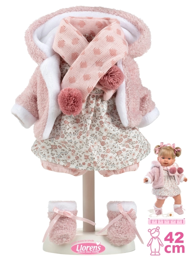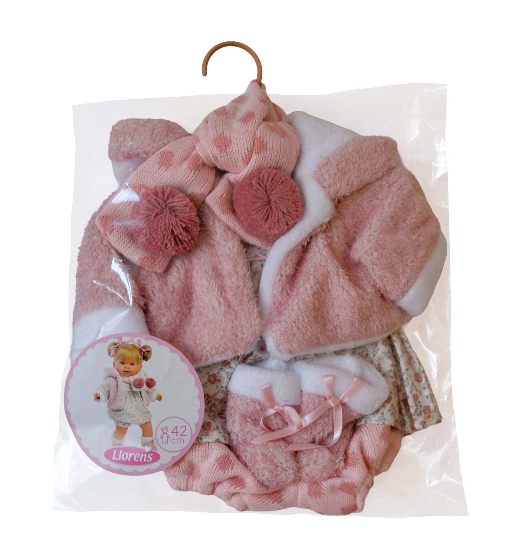 Stylowy zestaw dla lalek LLORENS w rozmiarze 42 cm ucieszy każdą małą elegantkę. Zawiera 5 starannie dopasowanych elementów z miękkich tkanin – różowy, puszysty płaszczyk z białą lamówką, czapkę/szal z pomponami, mitenki oraz kwieciste sukienkę z majteczkami. Ubranka są ręcznie wykonane w Hiszpanii i dostarczane w praktycznym opakowaniu z wieszakiem. Idealne do zabawy w odgrywanie ról i rozwoju motoryki małej. Odpowiednie od 3 lat.