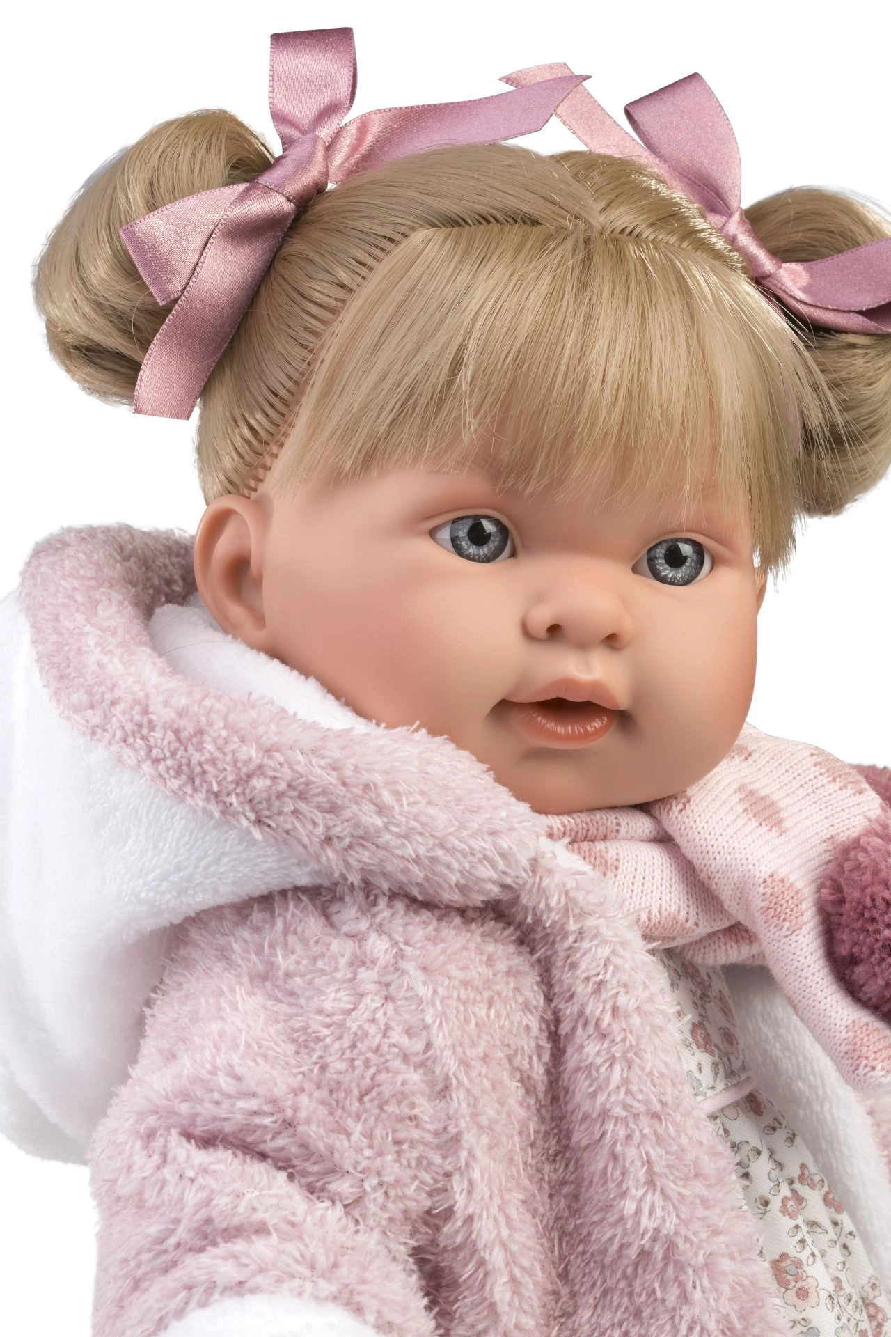 Różowy, puszysty płaszczyk z białą lamówką oraz dodatek z pomponami nadają lalce uroczy zimowy look, który wyróżni się podczas każdej zabawy.