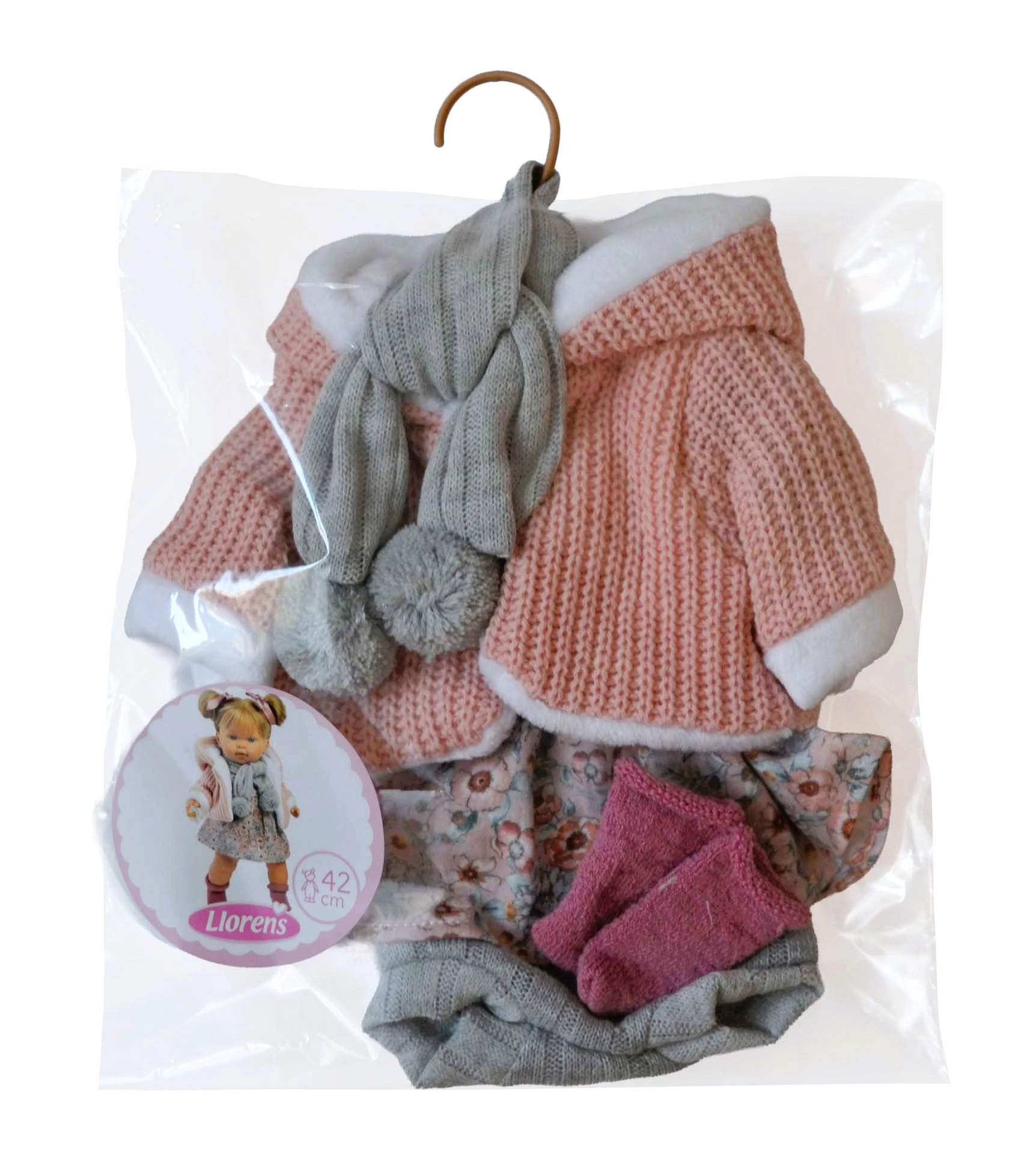 Stylowy 5‑częściowy zestaw ubranek dla lalek o rozmiarze 42 cm to doskonałe połączenie wygody i elegancji. Znajdziesz w nim różową dzierganą bluzę z kapturem, szary szalik z pomponami, kwiatową spódnicę, szare spodenki oraz różowe skarpetki. Zestaw jest ręcznie wykonany w Hiszpanii, starannie wykończony i idealny do rozwijania wyobraźni oraz umiejętności podczas przebierania lalek.