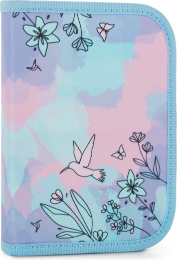 W komplecie znajduje się jednokomorowy piórnik z uchwytami i kieszenią z siatki oraz lekki worek ze ściągaczem – wszystko w harmonijnym pastelowym motywie z koliberkami.