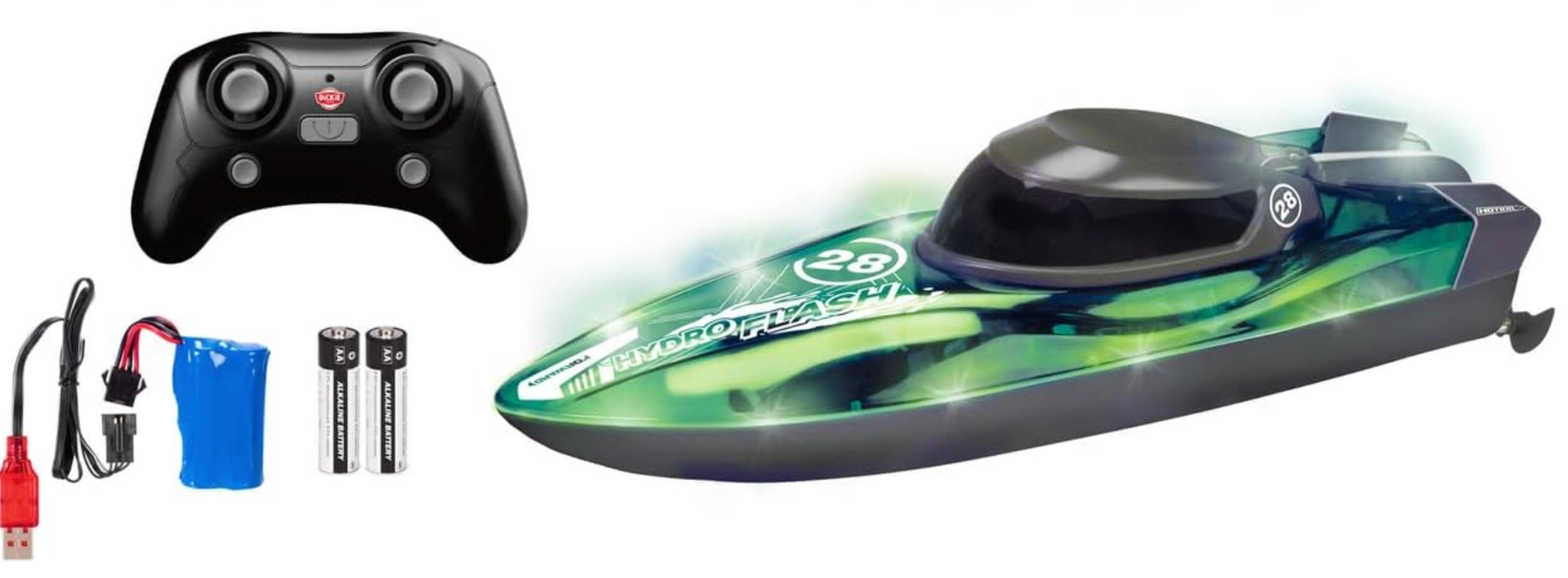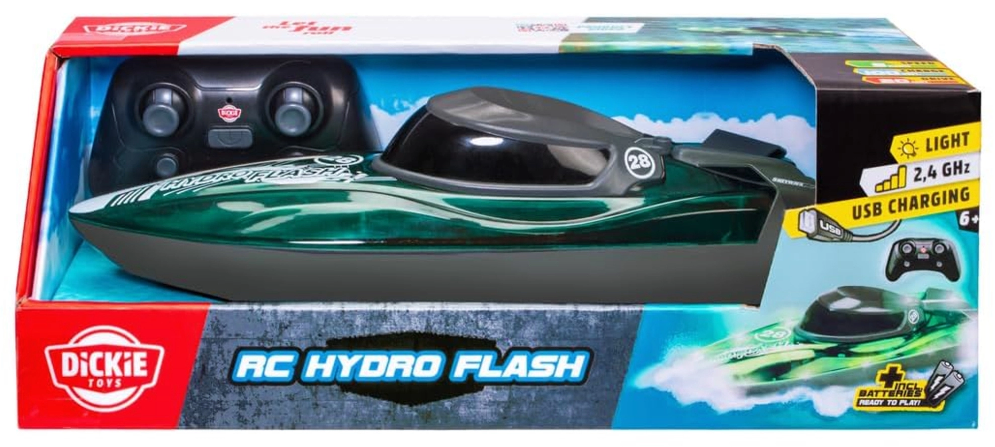 Odkryj dynamiczną zabawę na wodzie z RC łodzią DICKIE TOYS Hydro Flash. Dzięki technologii 2,4 GHz sterowanie jest stabilne i bez zakłóceń, więc możesz ścigać się z kilkoma modelami jednocześnie. Tryb Turbo zwiększa prędkość do 8 km/h, co zapewnia jeszcze więcej adrenaliny i frajdy.