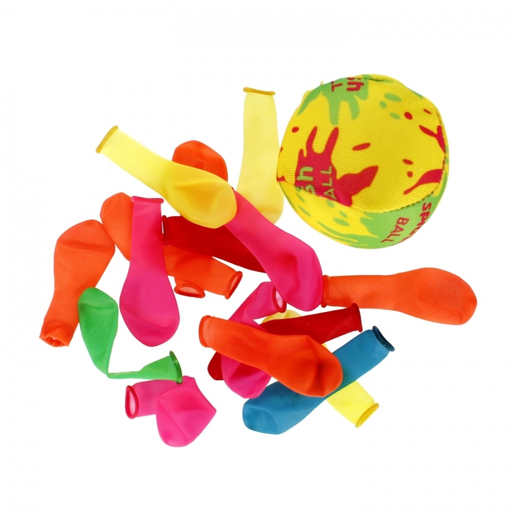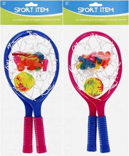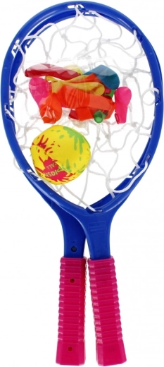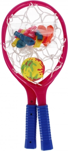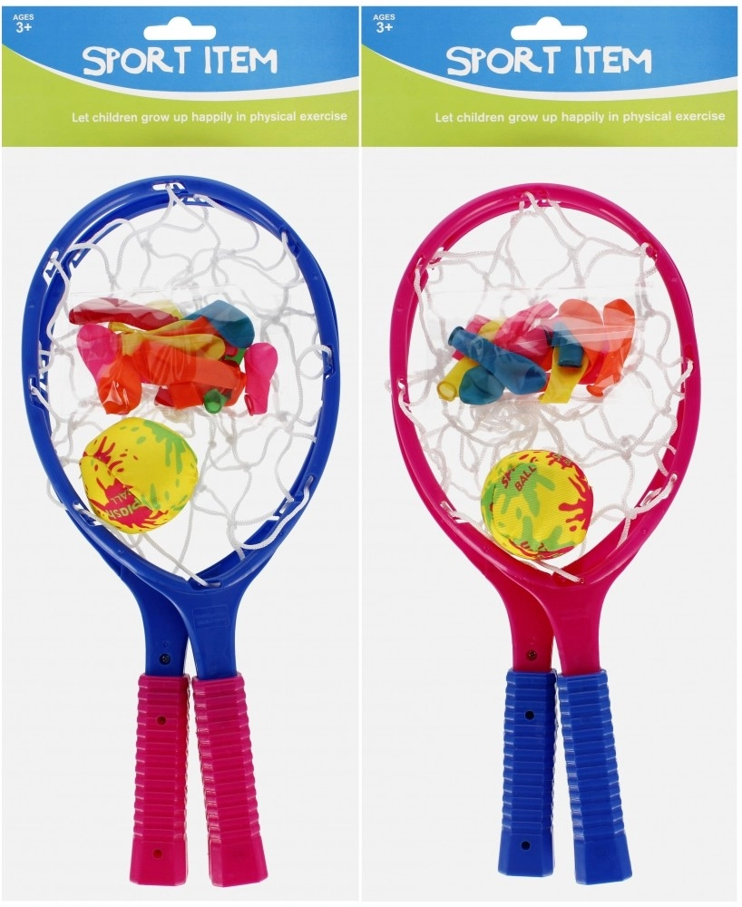 - 2 plastikowe rakiety z siatką, 1 miękka piłka, wodne baloniki (mix kolorów)