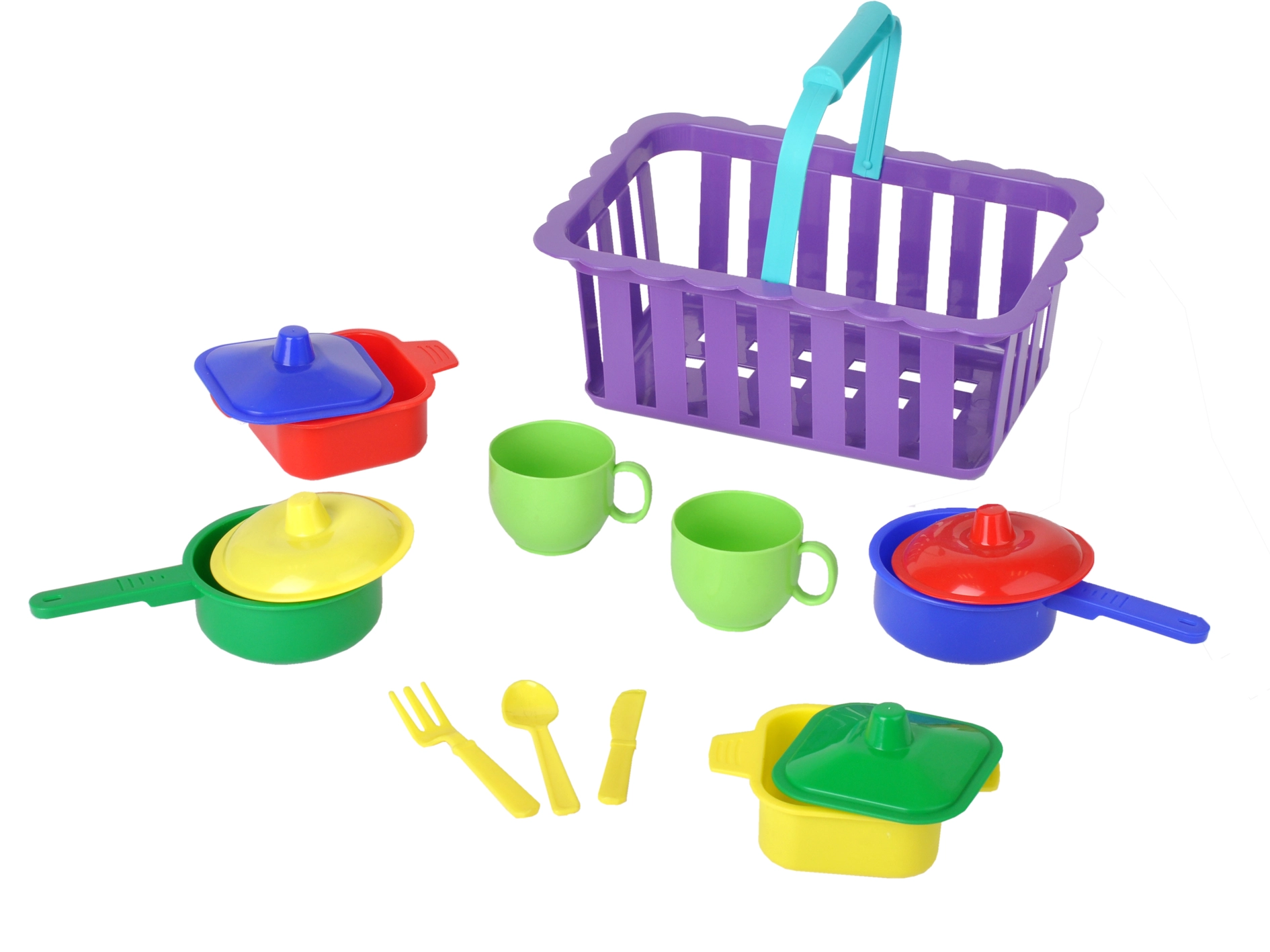 Wesoły dziecięcy zestaw naczyń w praktycznym koszyku ucieszy każdą małą kucharkę i kucharza. Zawiera garnki, patelnie, kubeczki i sztućce w żywych kolorach. Dzięki lekkiemu koszykowi wszystko można łatwo przenosić i przechowywać. Świetny wybór do zabawy w gotowanie, rozwijania wyobraźni oraz ćwiczenia motoryki małej.