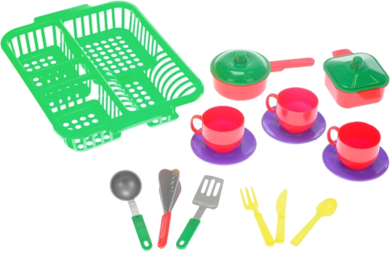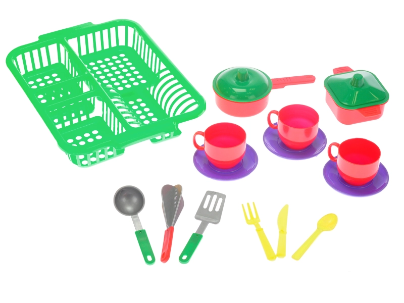 Ten dziecięcy zestaw naczyń z praktycznym ociekaczem oferuje wszystko, co potrzebne do zabawy w gotowanie i sprzątanie w kuchni. Dzięki trzem wersjom kolorystycznym zabawa jest jeszcze bardziej urozmaicona, a dzieci łatwo tworzą własne kuchenne rytuały.