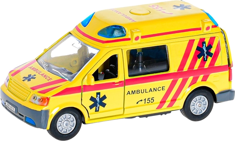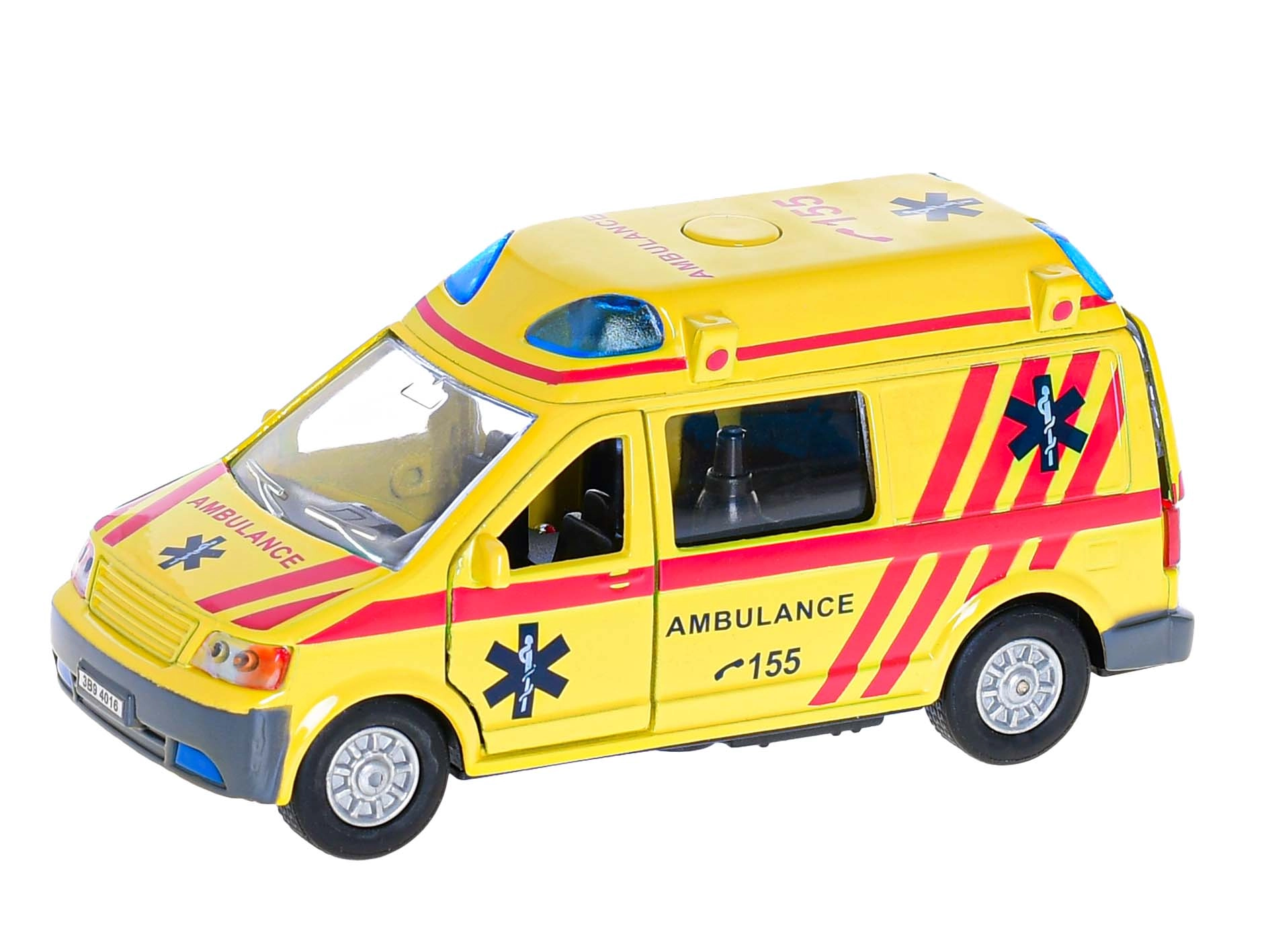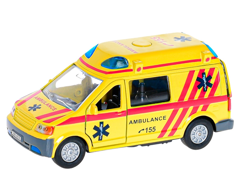 Solidne metalowe nadwozie zapewnia wytrzymałość. Dzięki napędowi typu pull-back wystarczy pociągnąć, a karetka ruszy do przodu.