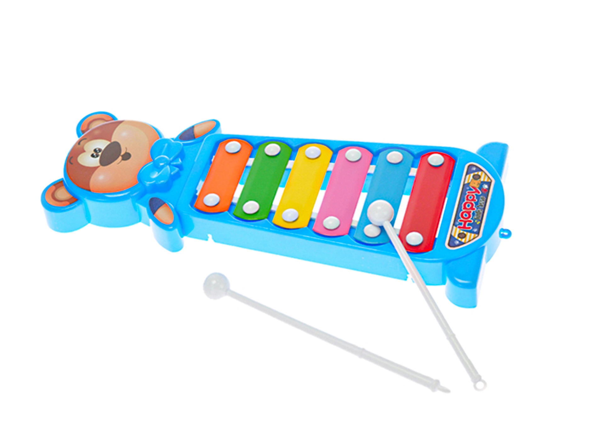 Uroczy ksylofon w kształcie misia ucieszy małych muzyków. Oferuje 6 kolorowych metalowych płytek do pierwszych melodii i 2 plastikowe pałeczki dla łatwego grania. Dzięki kompaktowemu rozmiarowi 28 cm jest idealny dla dziecięcych rączek i wspiera rozwój poczucia rytmu, słuchu i małej motoryki.