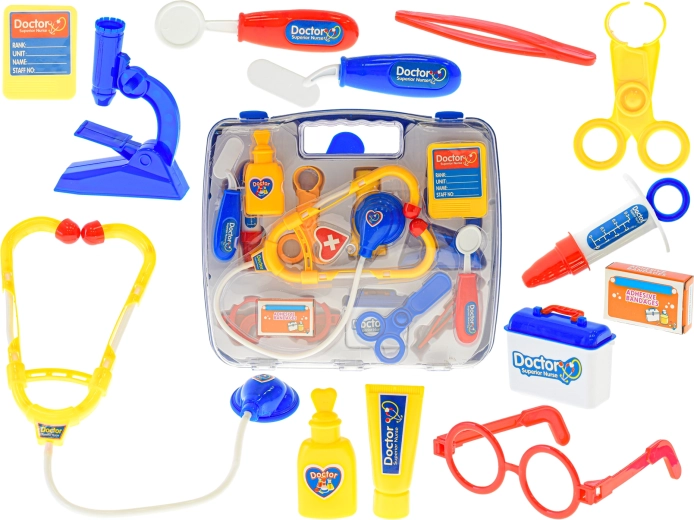 Zabawny i edukacyjny lekarski zestaw dla dzieci w praktycznym kufrze zawiera 14 sztuk plastikowych akcesoriów, bez których żaden mały lekarz ani lekarka się nie obejdzie. Wspiera wyobraźnię, zabawę w odgrywanie ról i motorykę małą i idealnie nadaje się do domowej przychodni oraz zabawy z przyjaciółmi.