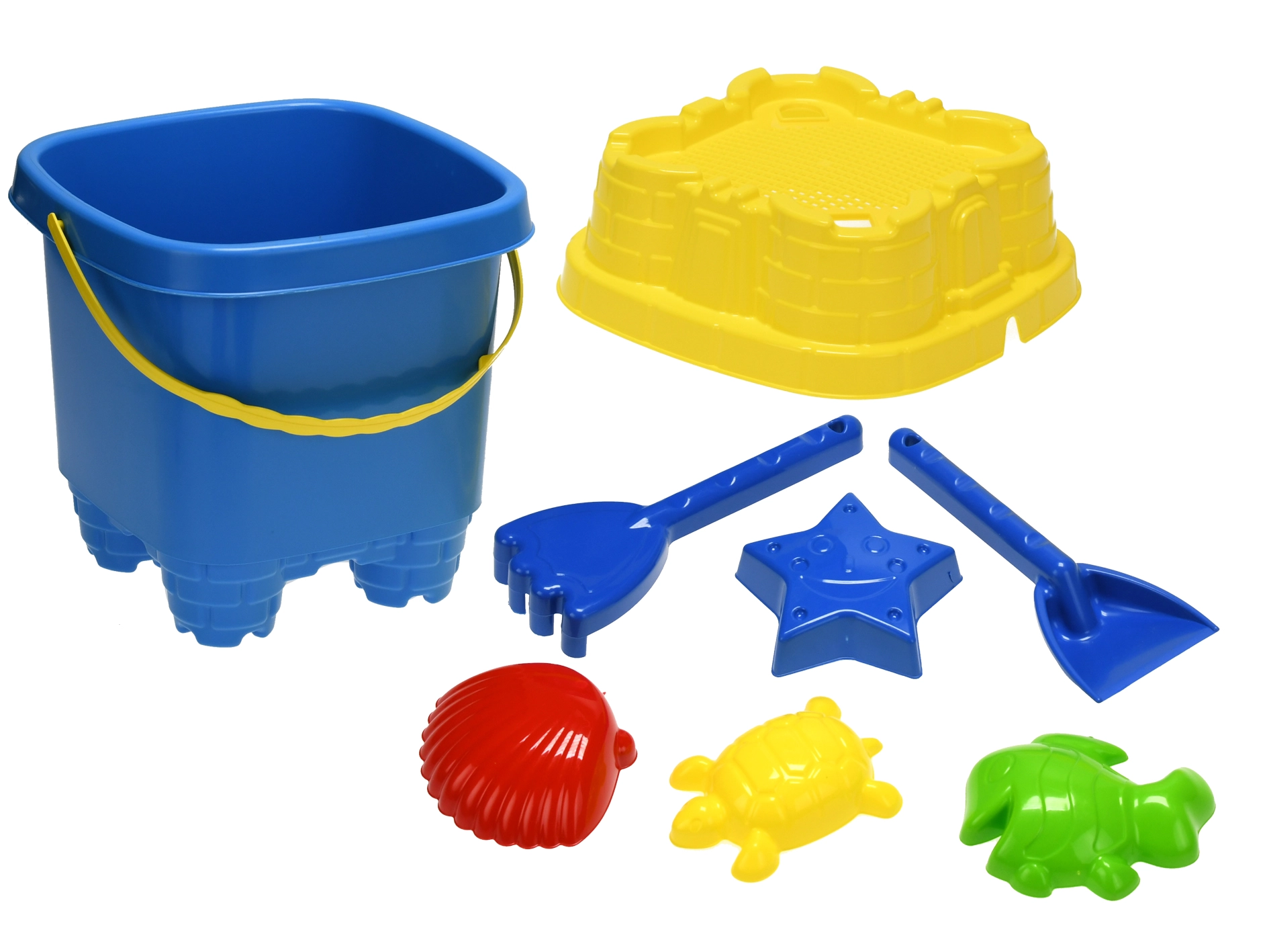 - Kompletny zestaw: wiaderko z pokrywką, łopatka, grabki i 4 foremki (10–11 cm)