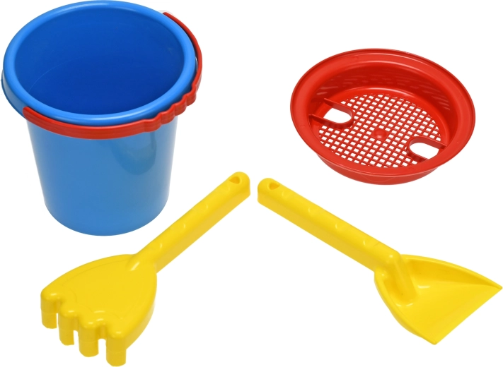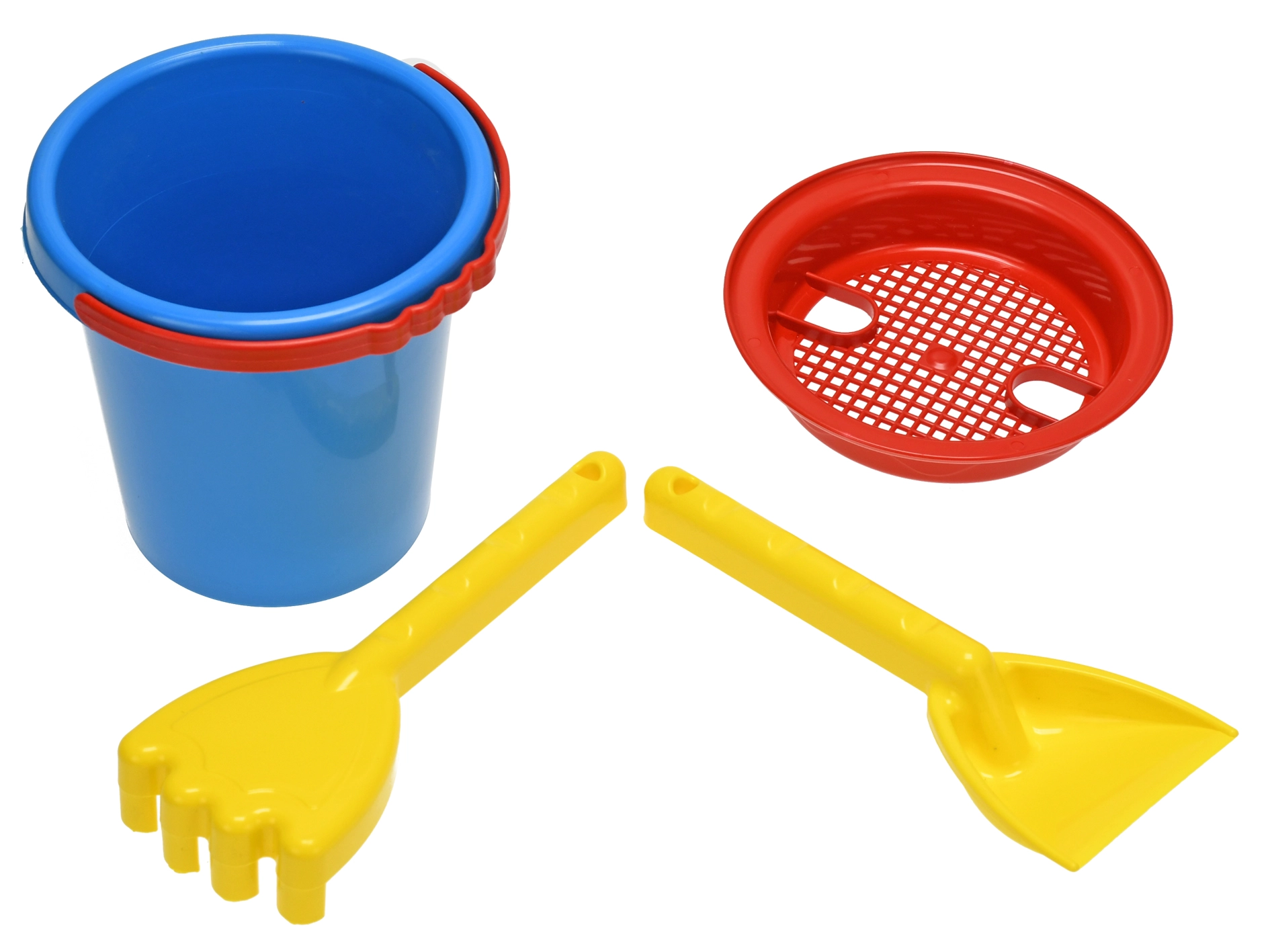 - Kompletny zestaw: wiaderko, sitko, łopatka i grabki