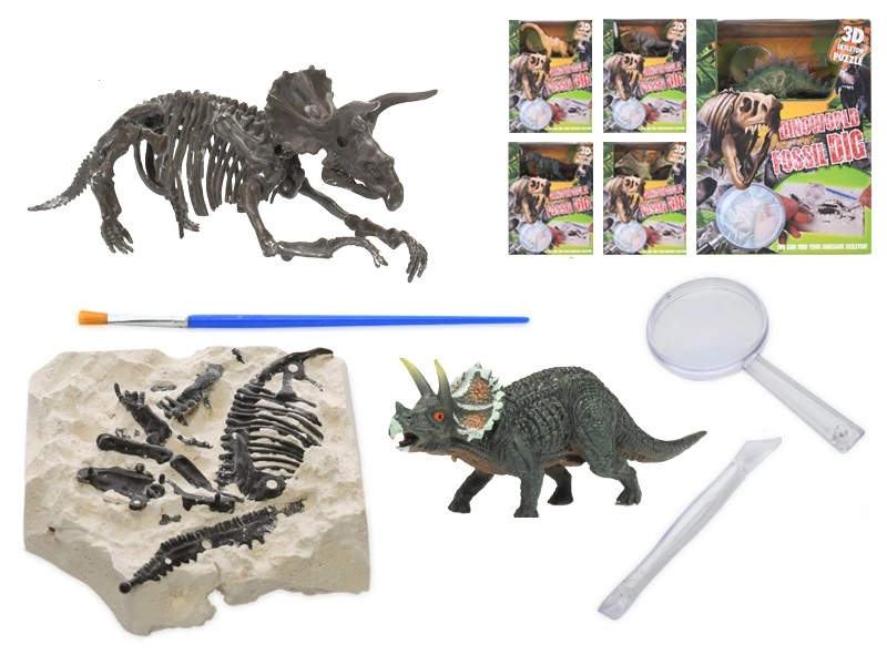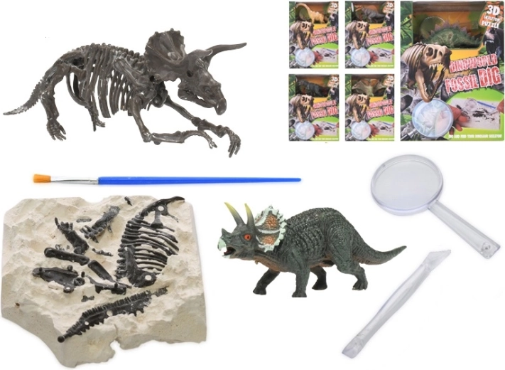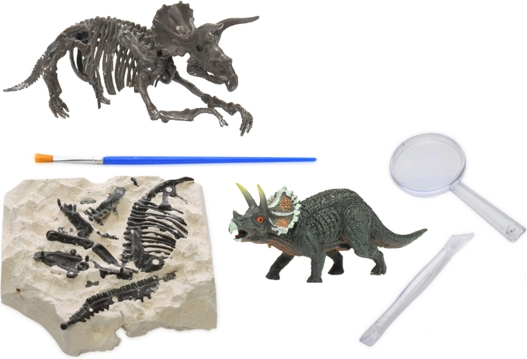 - Kompletny zestaw w opakowaniu: gipsowy blok ze skamieliną, dłuto, lupa, pędzelek i figurka dinozaura.