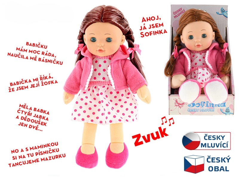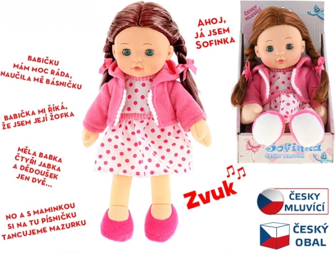 Lalka Sofinka to idealna towarzyszka dla dzieci od 3 lat. Jej miękkie ciałko jest przyjemne w dotyku i zachęca do przytulania, a realistyczny wygląd z brązowymi włoskami i mrugającymi oczami pobudza dziecięcą wyobraźnię. Sofinka dodatkowo mówi po czesku, co w atrakcyjny sposób rozwija komunikację i empatię.