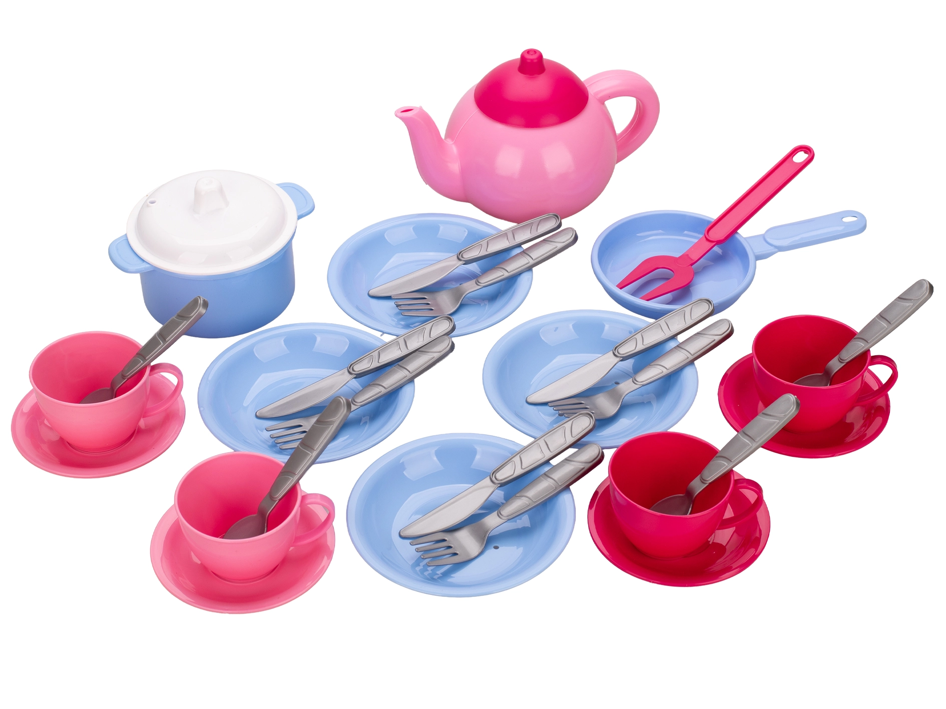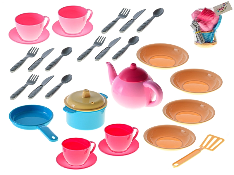Zabawny dziecięcy zestaw naczyń do kuchni z 30 kolorowymi elementami ucieszy małych kucharzy i kucharki. Zawiera czajnik, garnek z pokrywką, patelnię, talerze, sztućce, filiżanki i spodki do realistycznej zabawy w gotowanie i serwowanie. Lekki i wytrzymały plastik jest idealny dla dziecięcych rąk i wspiera wyobraźnię, małą motorykę oraz umiejętności społeczne. Odpowiednie dla dzieci od 3 lat.