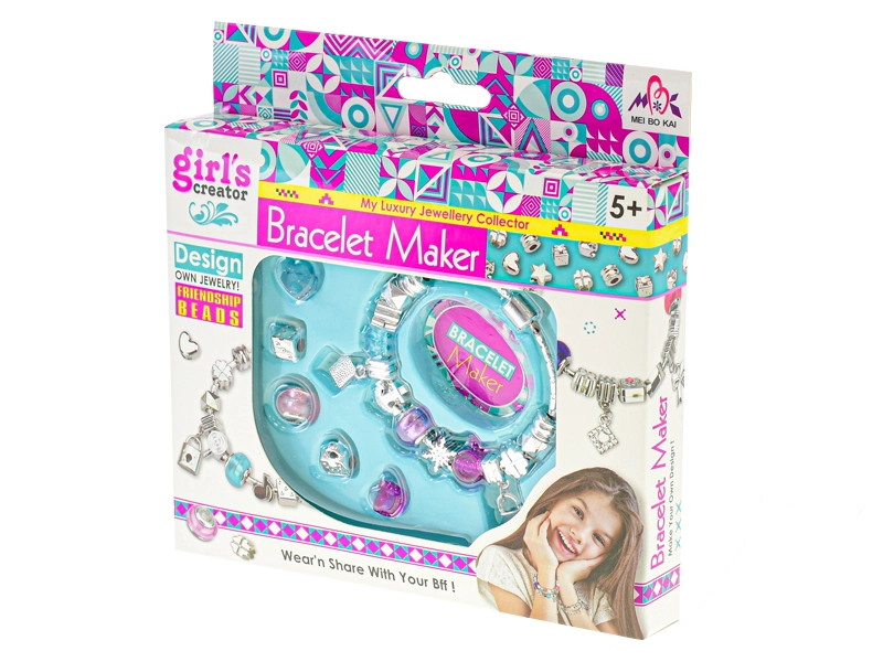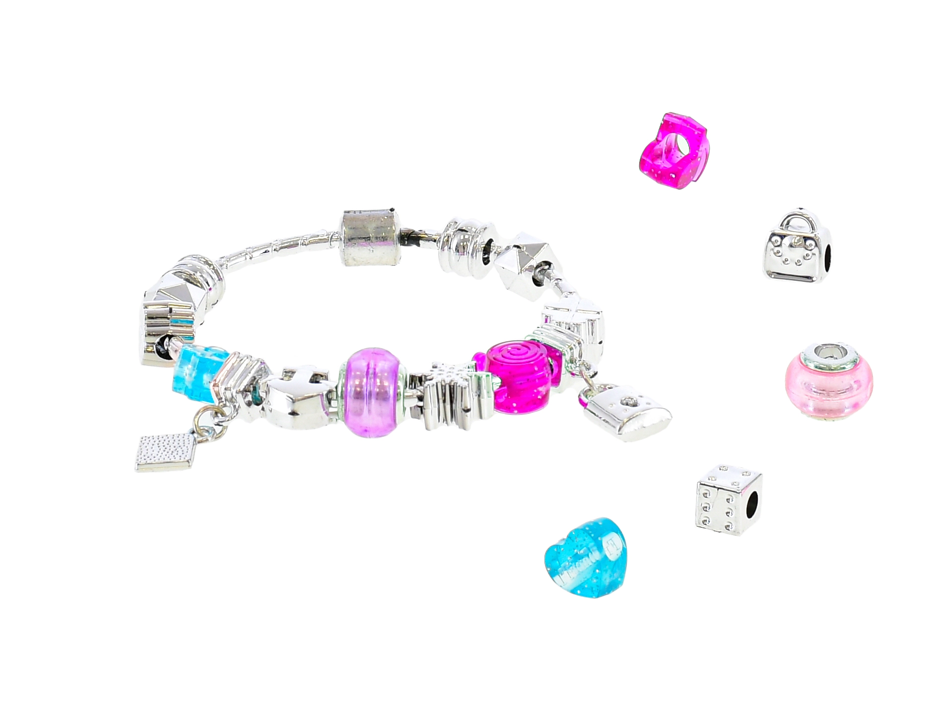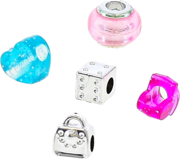 Kreatywny zestaw zawiera wytrzymałą plastikową bransoletkę oraz różne zawieszki i koraliki z dużym otworem dla wygodnego nawlekania. Dzieci mogą w kilka chwil skomponować własne kolorowe połączenia i zmieniać wygląd biżuterii w zależności od stroju lub nastroju.