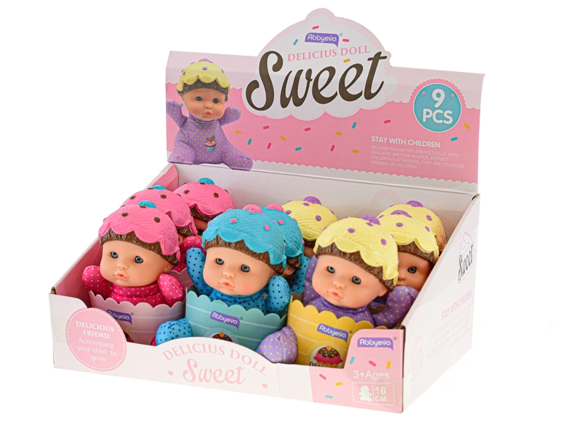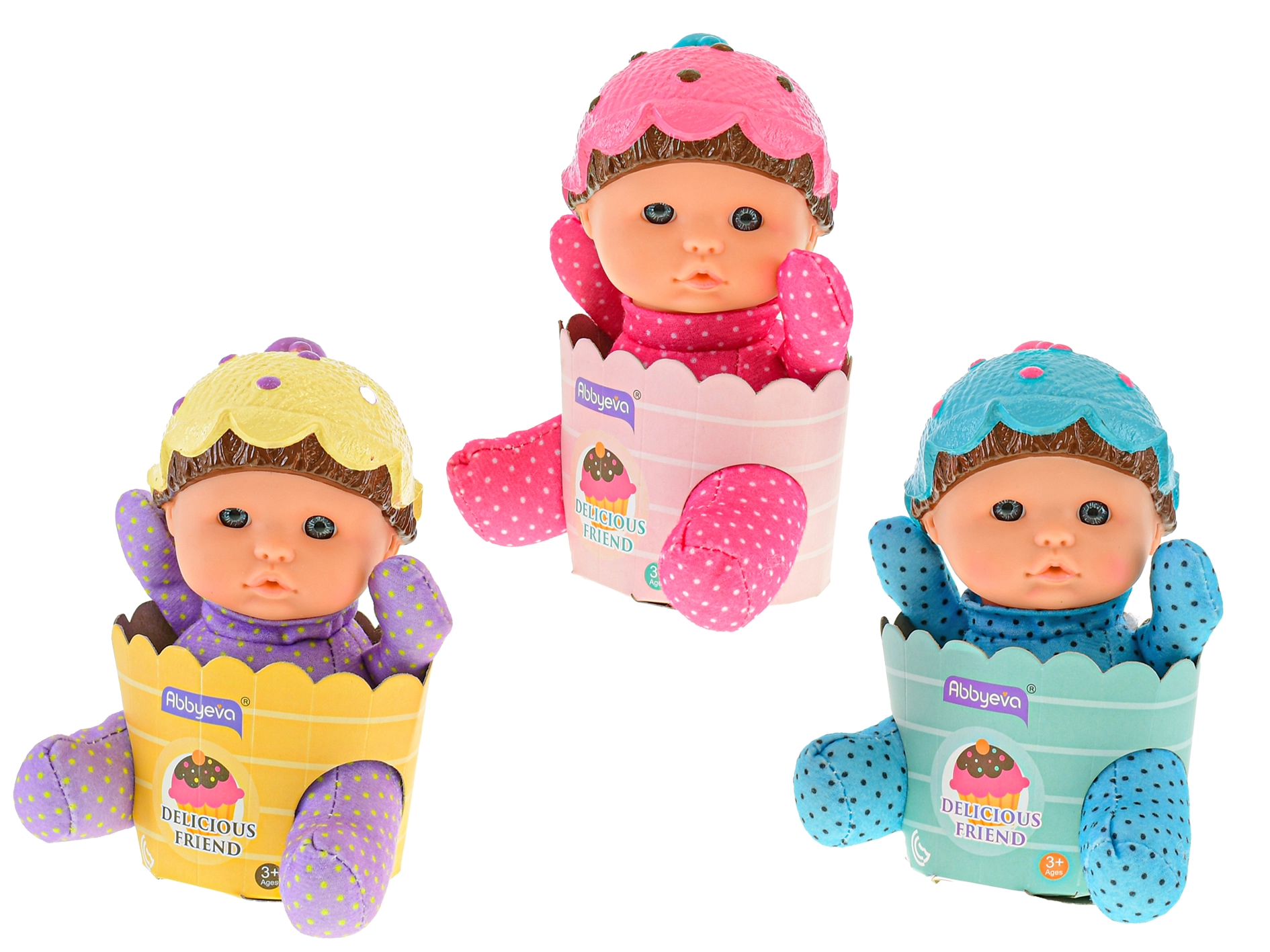 Wersje różowa, niebieska i fioletowa w groszki z czapeczką jak babeczka zachęcają do kolekcjonowania i wymiany między dziećmi.