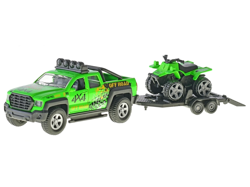Detaliczny pick-up 4×4 z przyczepą i quadem zapewnia autentyczne wrażenia z zabawy – solidne koła, lampy dachowe i najazdowa rampka wspierają kreatywne scenariusze.