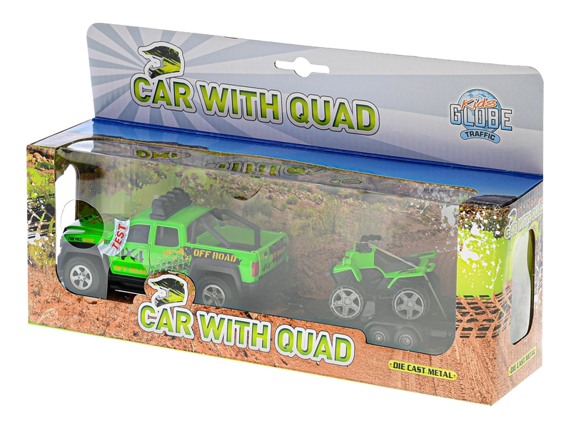 W zestawie znajduje się wszystko, czego dzieci potrzebują do natychmiastowej zabawy: auto, przyczepa, quad oraz baterie. Kompaktowe opakowanie ułatwia przechowywanie i przenoszenie, dzięki czemu zestaw sprawdzi się w domu i w podróży.