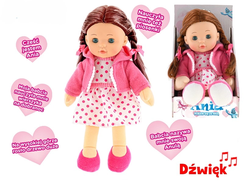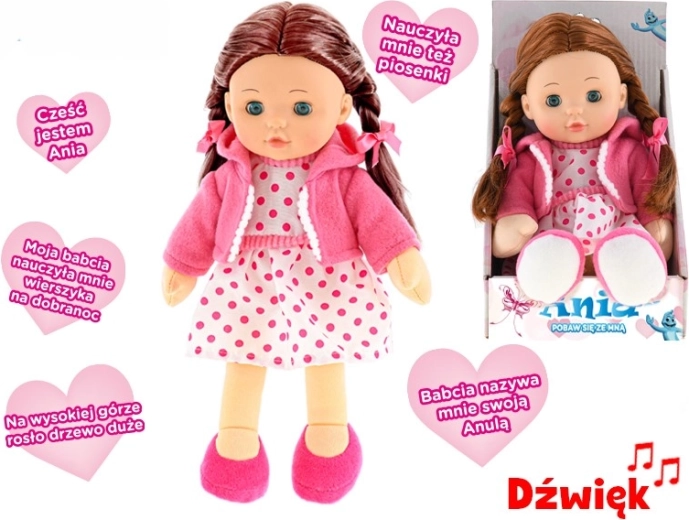 Lalka Ania to świetny wybór dla małych opiekunek i opiekunów. Ma 31 cm wysokości, brązowe włoski i jest ubrana w uroczy strój, który znajduje się w zestawie. Dzięki miękkiemu ciałku jest przyjemna do tulenia i bezpieczna także dla młodszych dzieci.