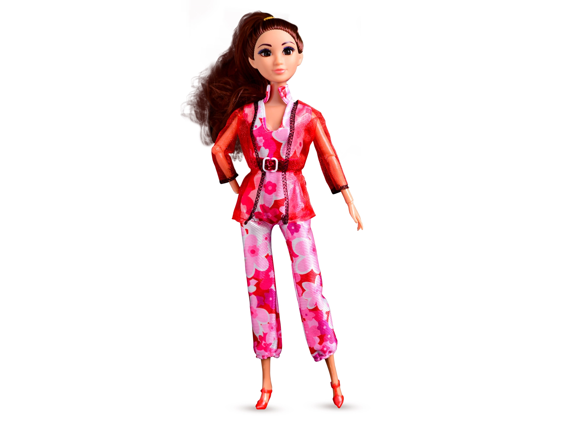 Jasmine ma na sobie wyrazisty różowy, kwiatowy kombinezon uzupełniony przezroczystą marynarką z paskiem i czerwonymi szpilkami. Efektem jest ponadczasowy modowy look, który pobudza kreatywną zabawę, stylizację i tworzenie historii.