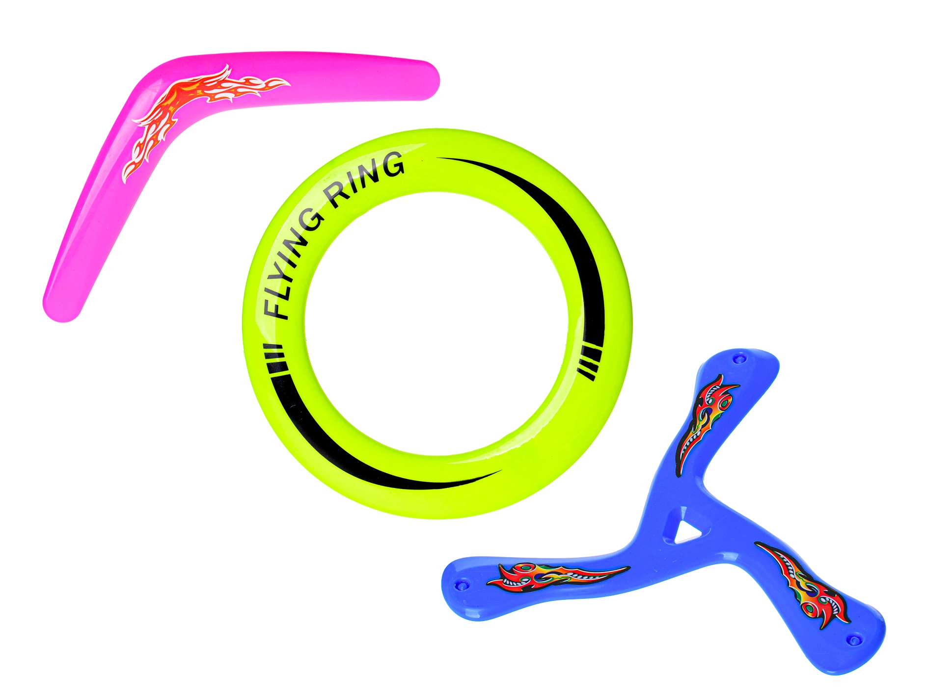 W opakowaniu znajdziesz trzy różne typy latających zabawek – klasyczne frisbee, dysk pierścieniowy i bumerang. Każdy element oferuje inny styl gry i treningu.