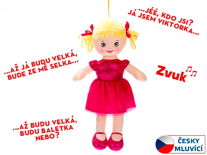 Lalka Viktorka to miękka materiałowa przyjaciółka do łóżeczka i w podróży. W pięknej sukience i bucikach zachęca do tulenia i zabawy, a jednocześnie rozwija percepcję słuchową i więź emocjonalną dzięki miłemu głosowi i piosence „Gdy będę duża, zostanę gospodynią…”.