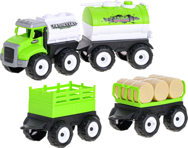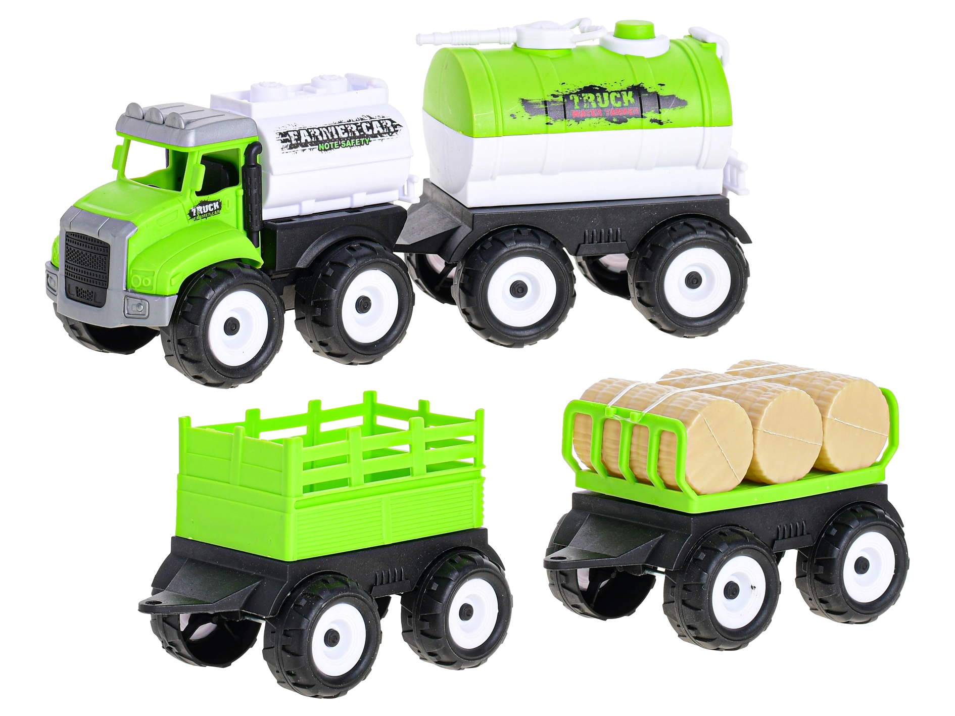 W zestawie znajdują się aż trzy przyczepy, które poszerzają możliwości zabawy: cysterna do przewozu cieczy, przyczepa do drewna oraz uniwersalna skrzyniowa. Dzieci mogą tworzyć różnorodne scenariusze i naturalnie rozwijać myślenie logiczne oraz wyobraźnię.