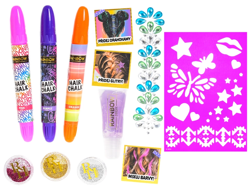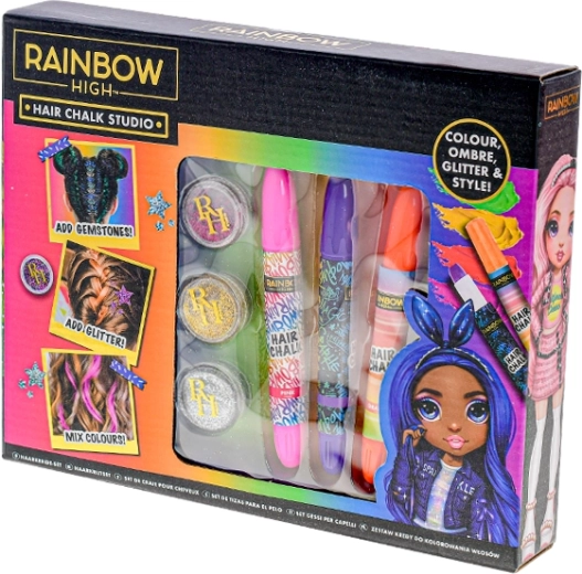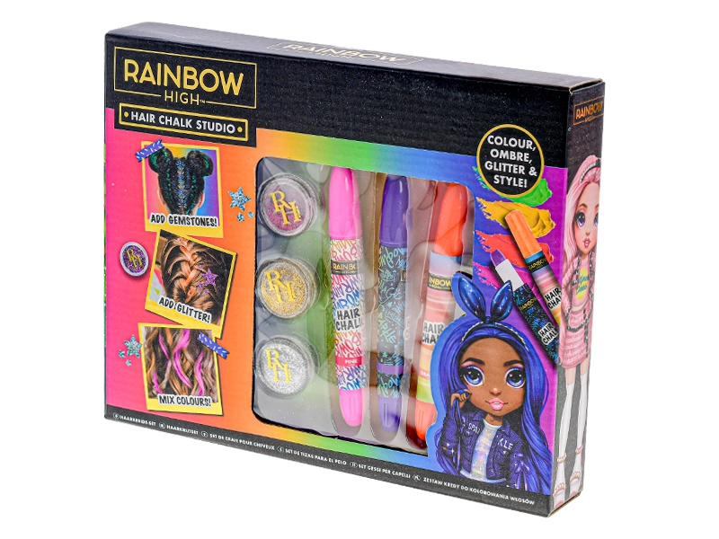 Idealny dla fanek RAINBOW HIGH, na dziecięce przyjęcia i kreatywne popołudnia. Zestaw to świetny pomysł na prezent i mnóstwo zabawy bez trwałych zmian we fryzurze.