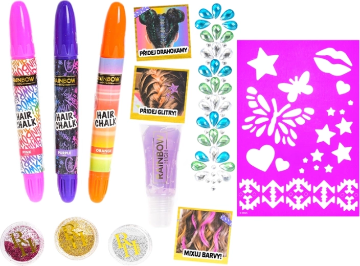 Rozjaśnij każdy dzień z kreatywnym zestawem RAINBOW HIGH! Ten dekoracyjny zestaw do włosów oferuje łatwe i zabawne możliwości stylizacji dla małych miłośniczek mody. Zawiera kredy do włosów, kryształki, szablony, żel i brokat do szybkiej metamorfozy fryzury bez trwałych zmian – idealny jako prezent urodzinowy lub na inną specjalną okazję.