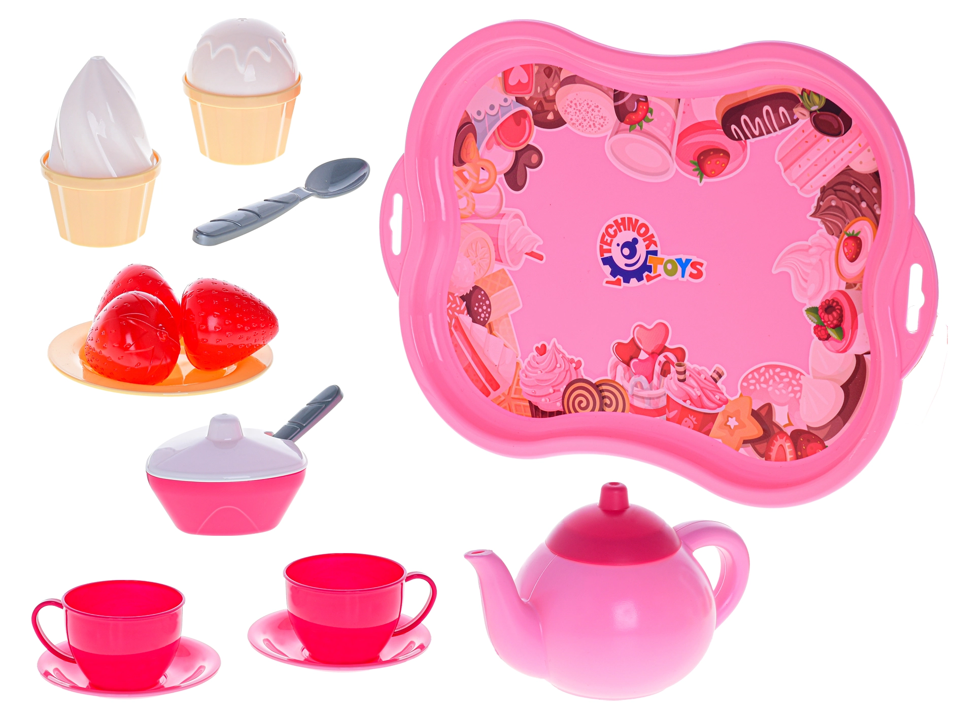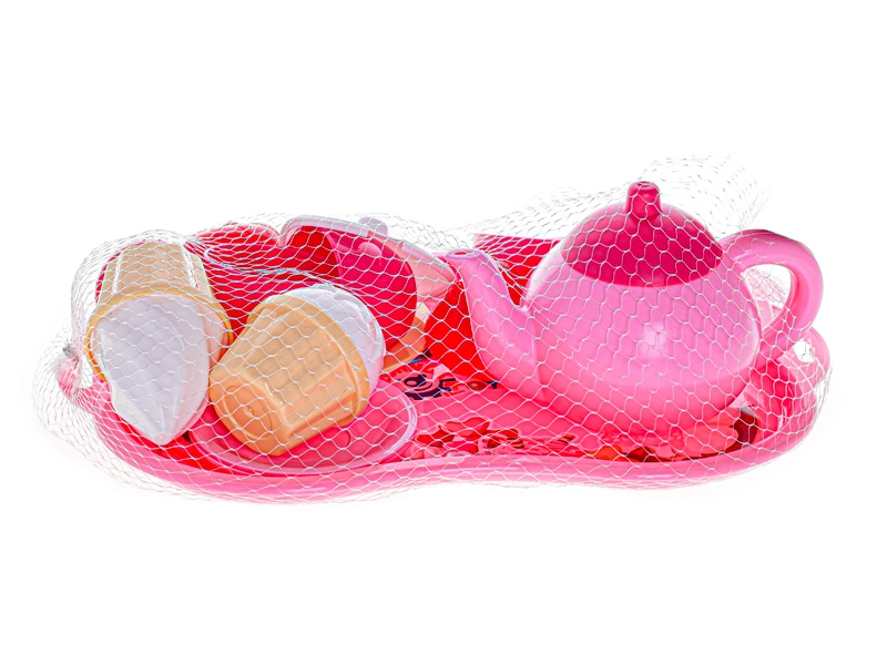 W komplecie znajduje się ozdobna taca, dzbanek z pokrywką, filiżanki ze spodkami, łyżeczki, drobne owoce i słodkie desery w stylu lodów. Zestaw jest umieszczony w praktycznej siateczce, więc łatwo go przenosić i sprzątać.