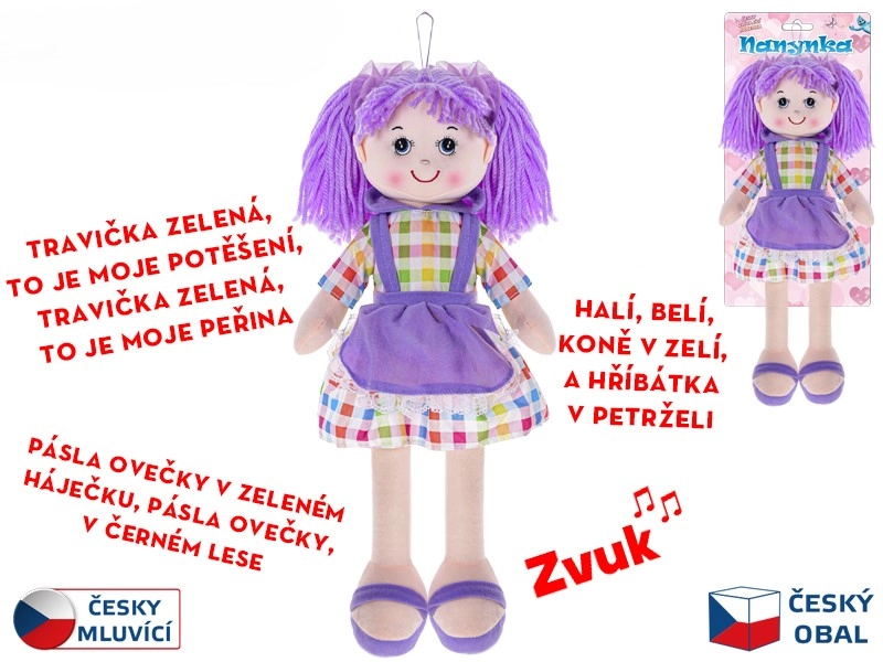 Urocza lalka Nanynka z miękkim ciałkiem ucieszy każdą małą księżniczkę. Ma wysokość 50 cm, jest ubrana w fioletową sukienkę i dzięki funkcjom mówi i śpiewa po czesku. Jej miękkie wykonanie zapewnia bezpieczną i wygodną zabawę już od urodzenia. W zestawie znajduje się zasilanie na 3× baterię guzikową LR44.