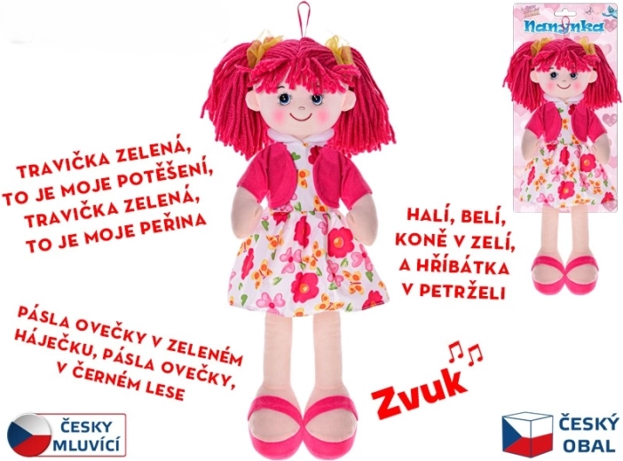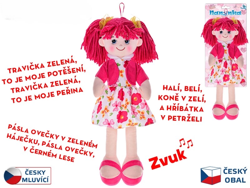 Materiałowa lalka Nanynka zachwyci dzieci delikatnym wyglądem i miękkim w dotyku ciałem. Dzięki wysokości 50 cm łatwo ją trzymać, przytulać i towarzyszy dzieciom podczas zabawy oraz zasypiania. Po naciśnięciu brzuszka Nanynka śpiewa ulubione czeskie piosenki (np. „Halí, belí…”, „Travička zelená…”, „Pásla ovečky…”) oraz recytuje, wspierając rozwój percepcji słuchowej, poczucia rytmu i umiejętności językowych.