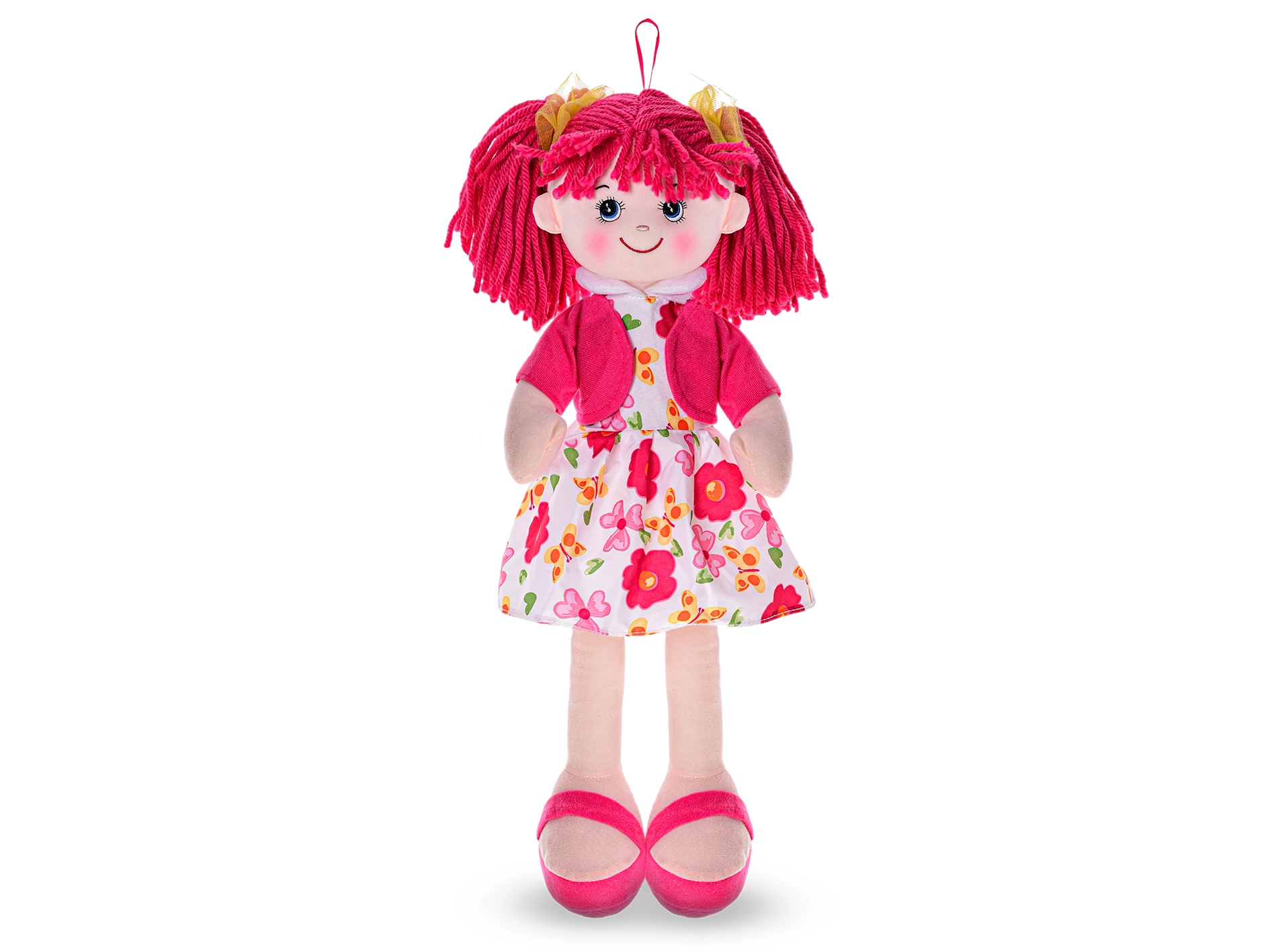 Lalka wykonana jest z miękkiego materiału tekstylnego, przyjemnego w dotyku i bezpiecznego dla niemowląt. Dzięki czerwonemu ubranku przyciąga wzrok i szybko staje się ulubioną przyjaciółką do wózka i łóżeczka. Baterie (3× AG13) są już dołączone, więc lalka jest gotowa do natychmiastowego użycia.