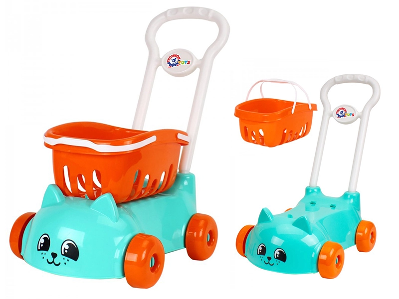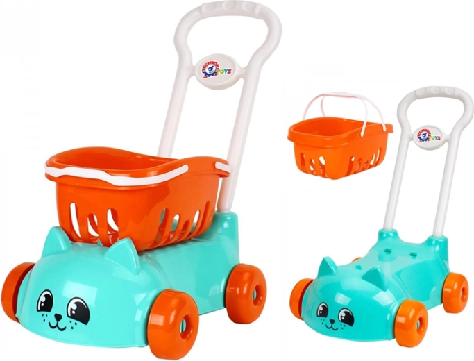 Turkusowy dziecięcy wózek zakupowy z motywem kota wspiera kreatywną zabawę i rozwój umiejętności społecznych. Dzieci mogą naśladować zakupy jak dorośli, uczyć się sortowania produktów i rozwijać wyobraźnię. Dzięki odłączanemu koszykowi wózek łatwo dopasować do różnych zabaw i zadań.